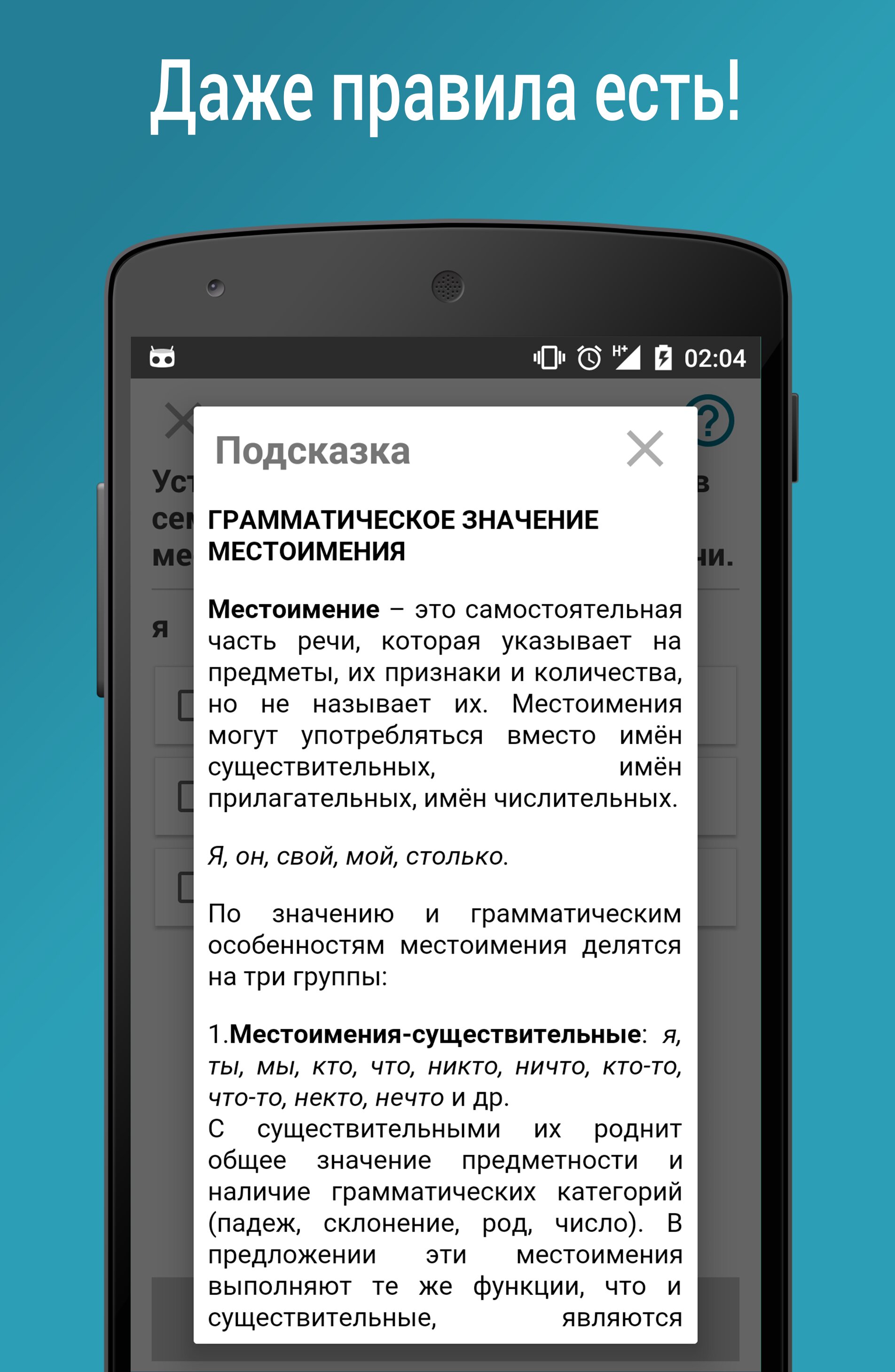 Таким образом, можно начинать работу с приложением, не потратив ни одного рубля.После установки приложения «Русский язык» для Android у Вас появится возможность для изучения русского языка прямо на мобильном устройстве. Ответы на более чем 15 000 вопросов, составленных в соответствии со школьной программой, вместе с “Подсказками» помогут вспомнить правила.