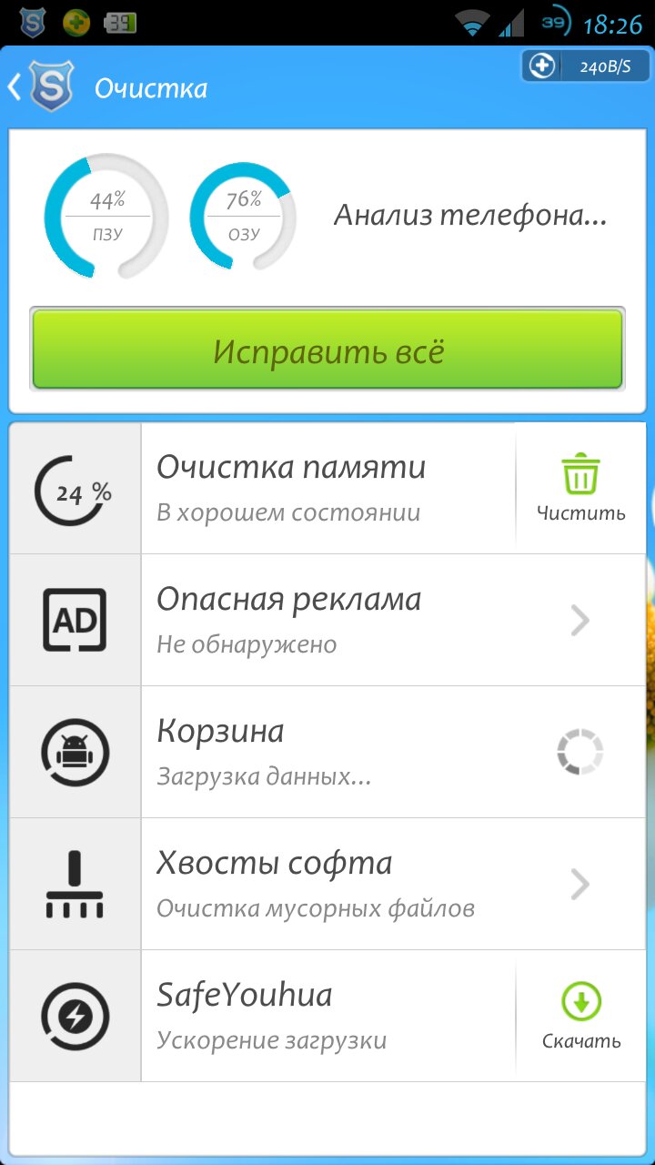 - Оптимизация системы, в которую входит: очистка памяти, очистка кэш, оптимизация расхода аккумулятора, а так же информация о системе смартфона.