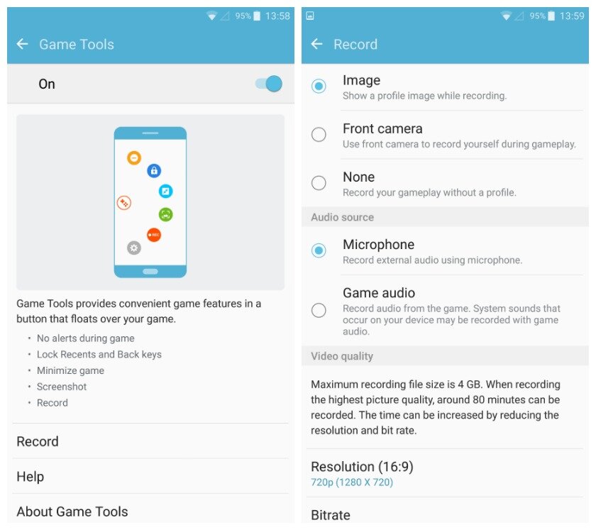 При захвате видео игрового процесса можно выбрать разрешение, включить/отключить отображение аватара пользователя, включить съёмку с фронтальной камеры в небольшом окне, включить микрофон для записи комментариев и отключить звуки из игры.