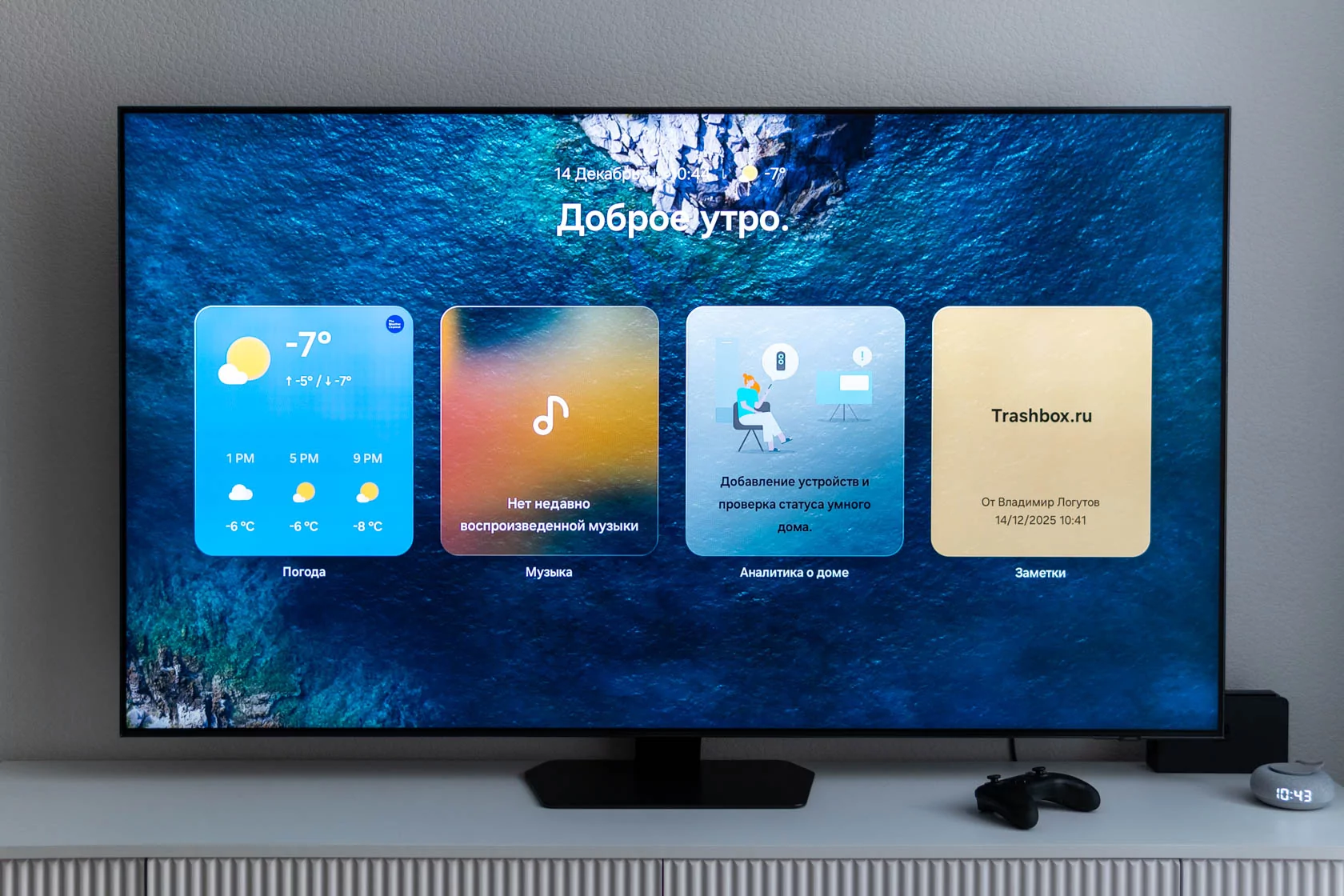 Все телевизоры Samsung работают на Tizen. В этом году интерфейс One UI обновили: сделали более строгим и слегка изменили цветовую схему. Суть осталась прежней, телевизор работает очень быстро, а каталог сторонних приложений очень богатый.