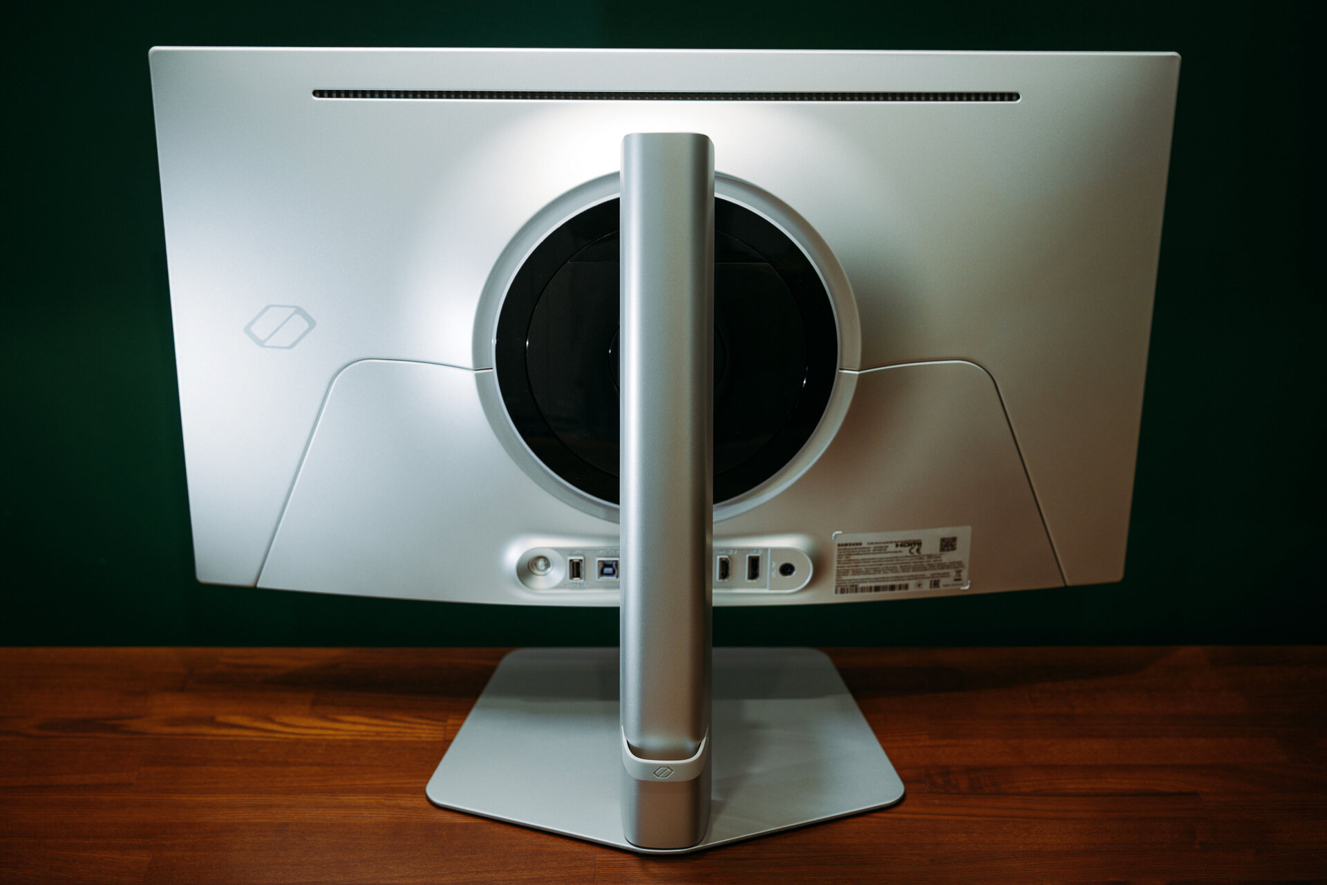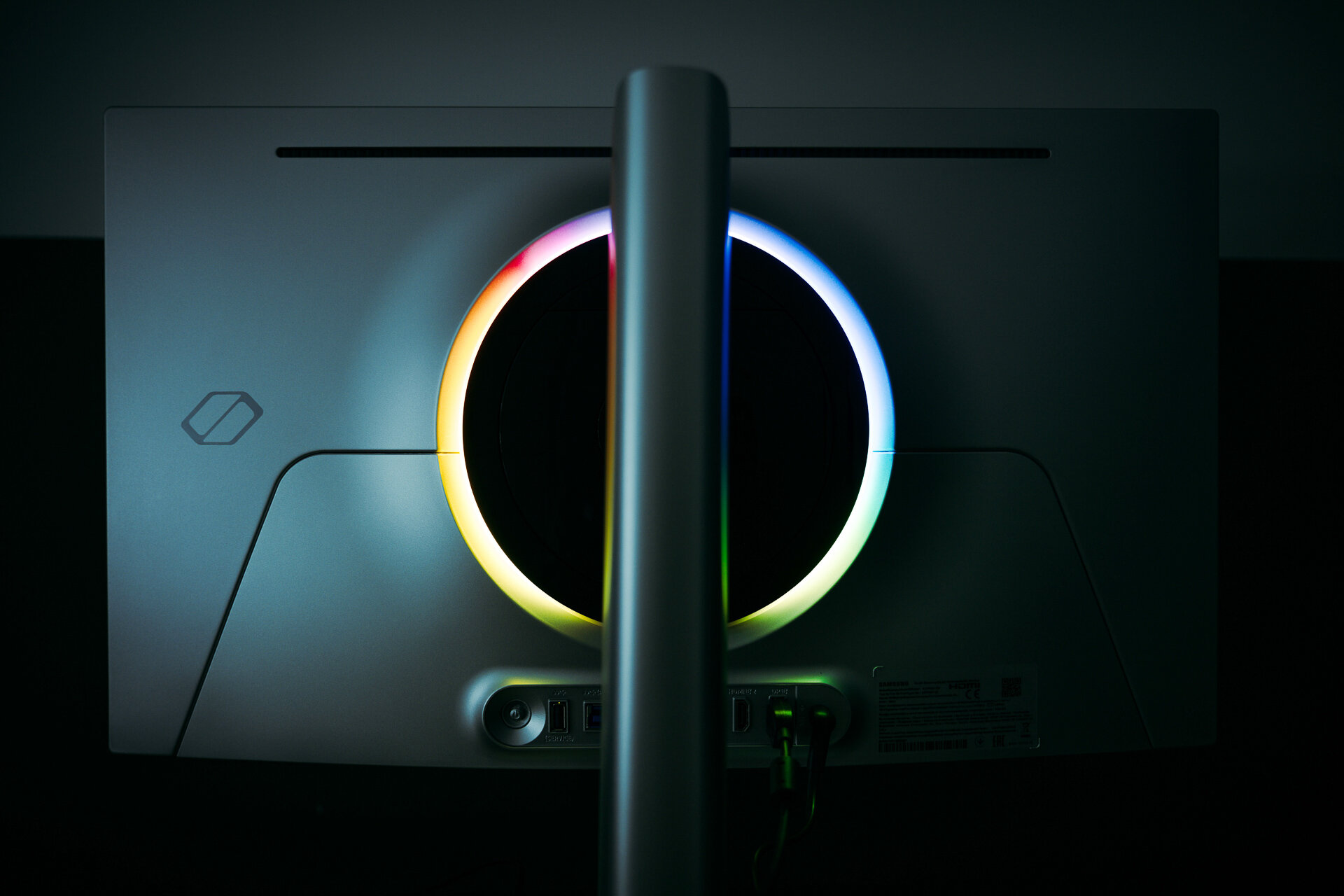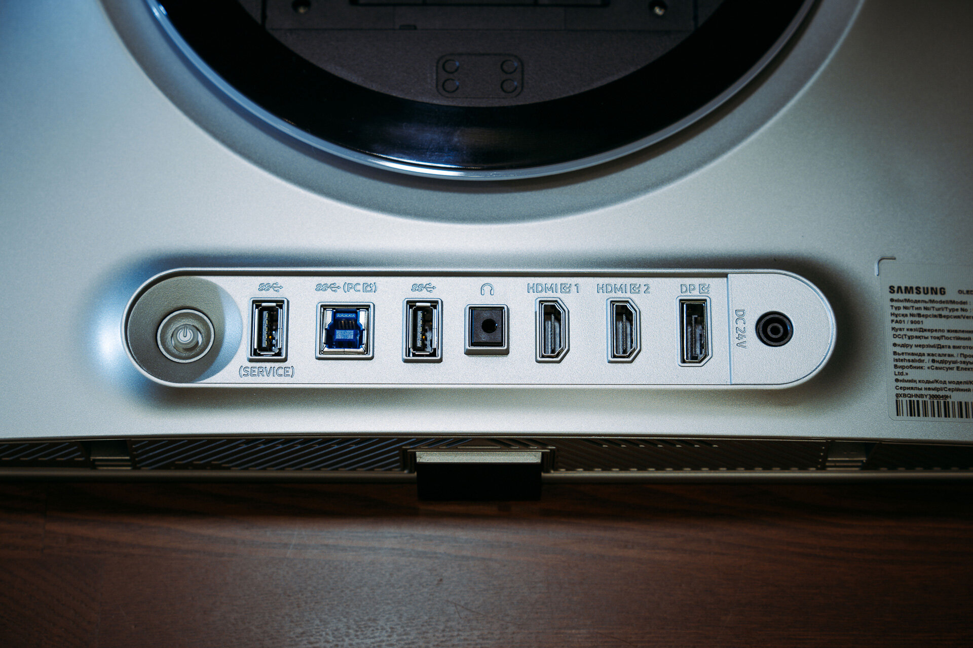 Прямо под светодиодным кольцом расположена панель портов, включающая один DisplayPort 1.4, два HDMI 2.1, два USB-A 3.2 Gen1, один USB-B и один разъём для наушников — последний здесь необходим, поскольку в модели нет динамиков, что стало следствием отказа от Smart TV и стремления снизить стоимость. Как по мне, это правильное решение, поскольку динамики в мониторах никогда не славились очень высокой громкостью или кристальным качеством. А вот чего не хватает, так это порта USB-C — в модели 2025 года он должен был быть.