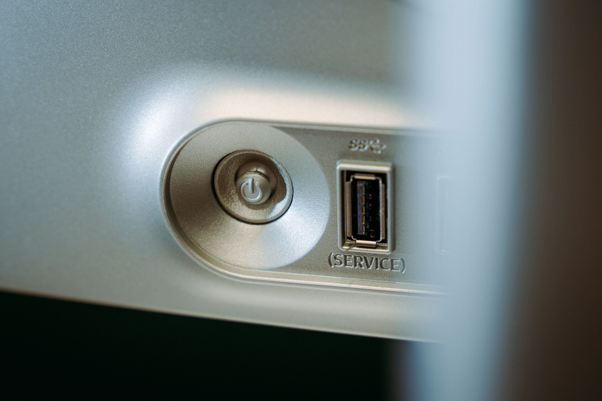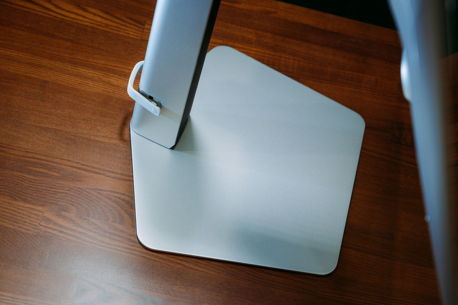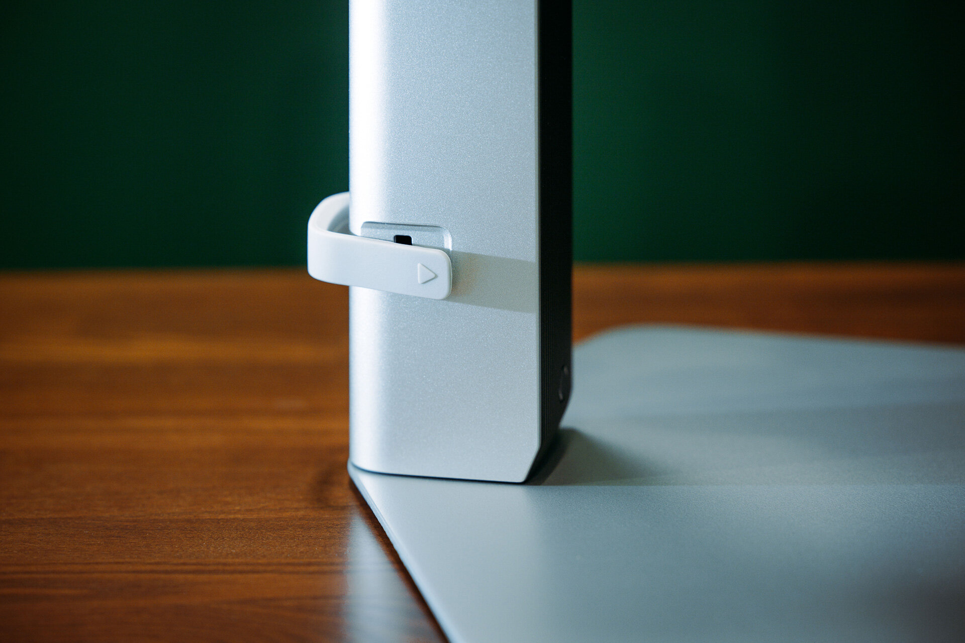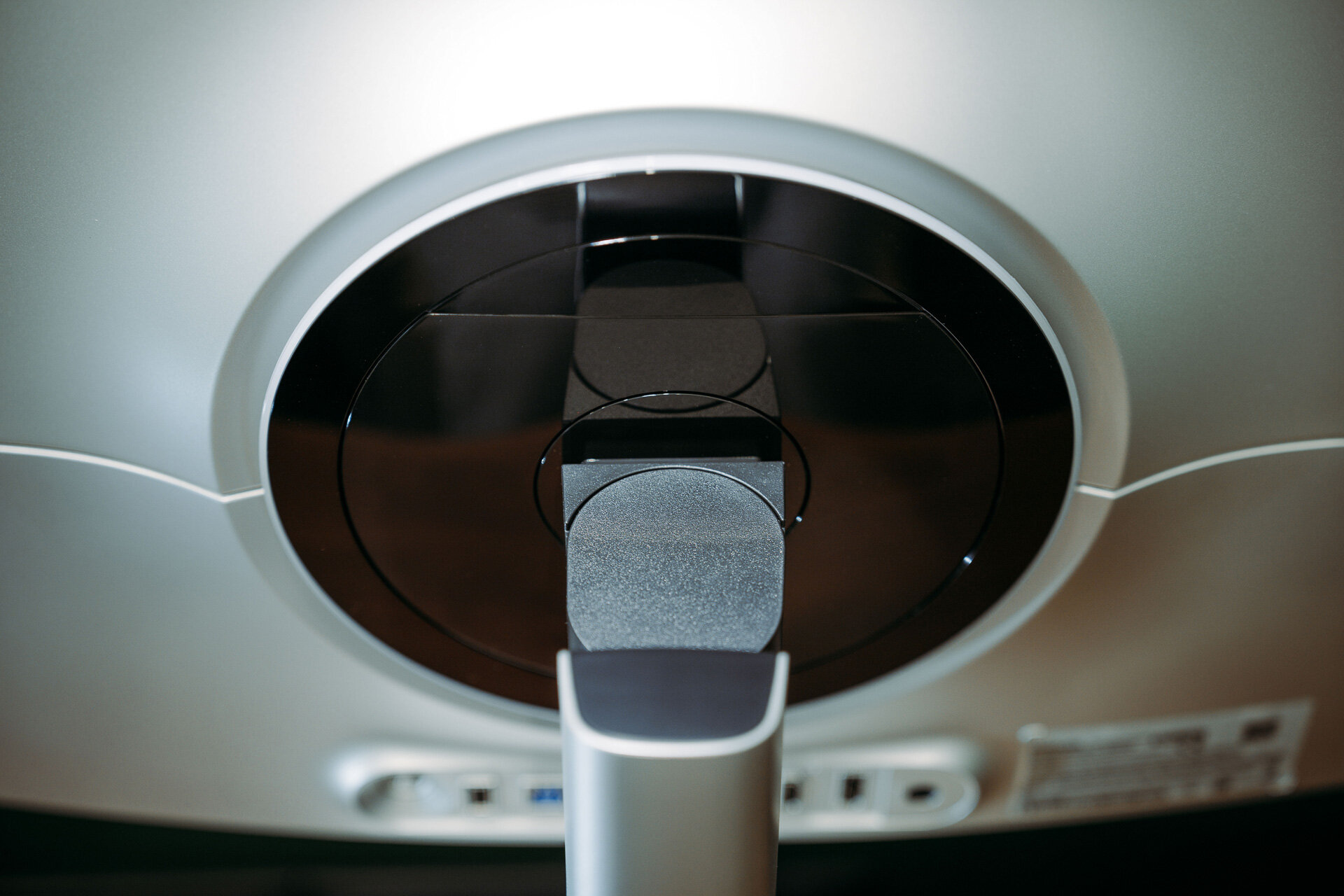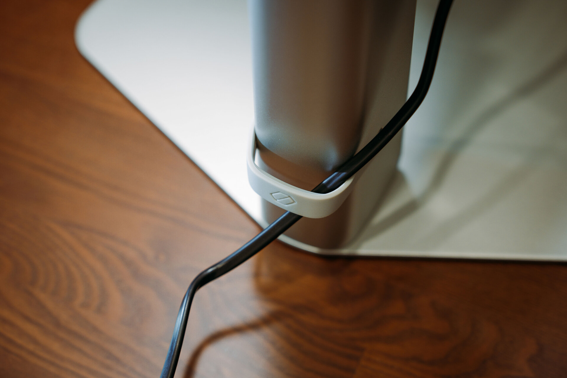 Рядом с интерфейсами расположен джойстик для управления настройками монитора. Весь этот хаб расположен по центру, то есть перед подставкой, не просто так — к ножке прикреплён резиновый хомут, помогающий закрепить кабели в едином положении.
