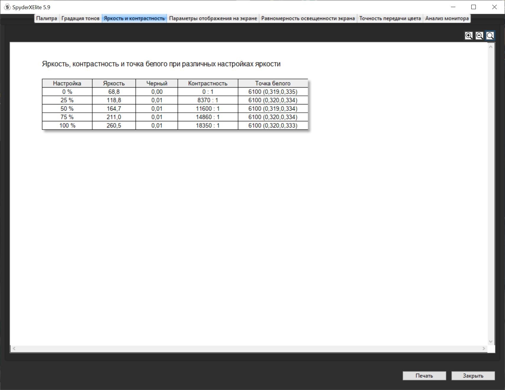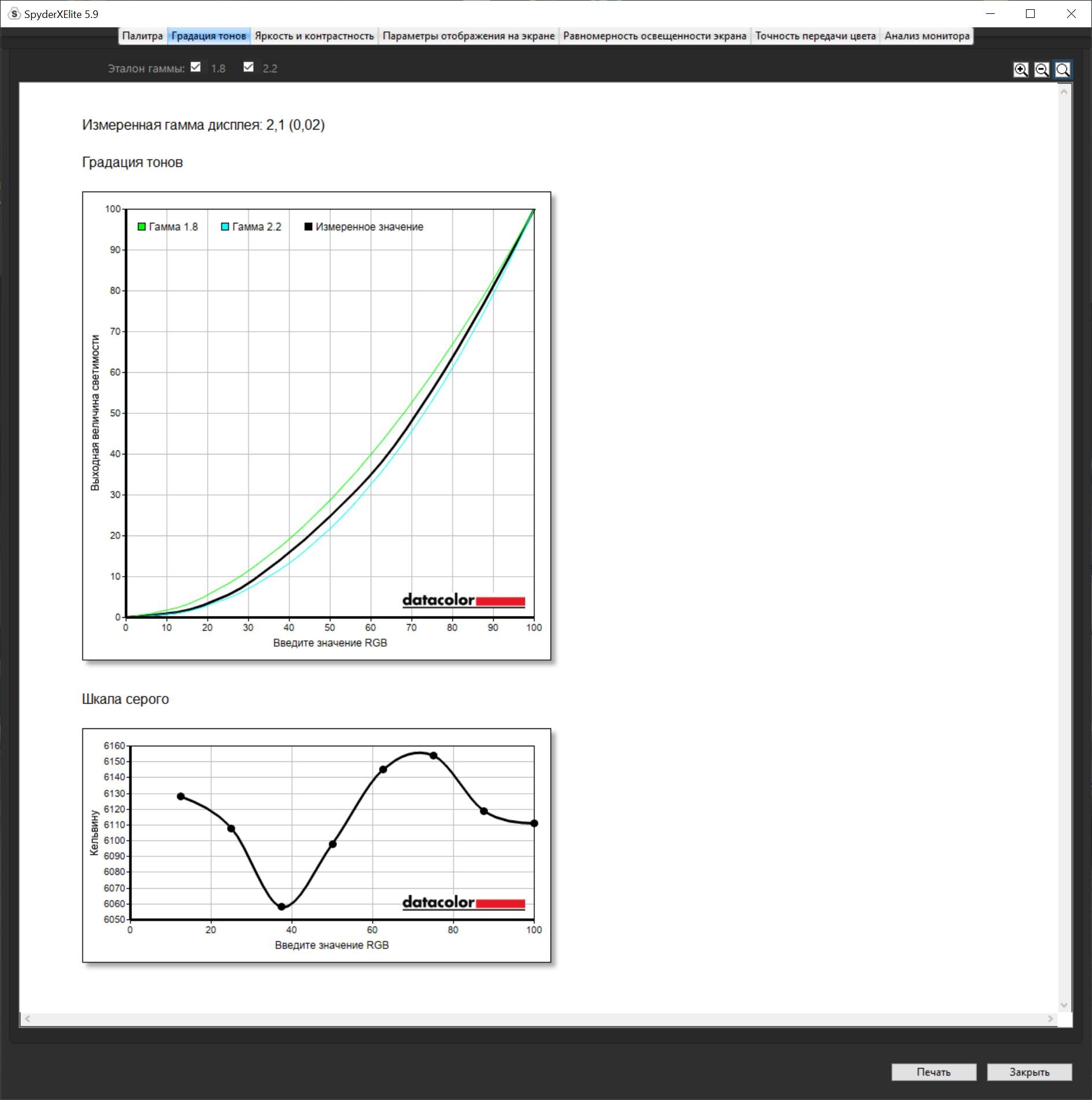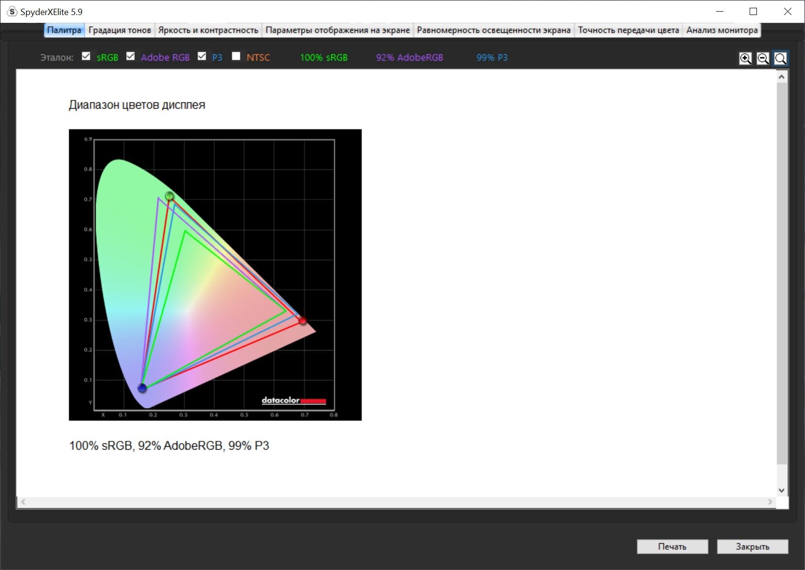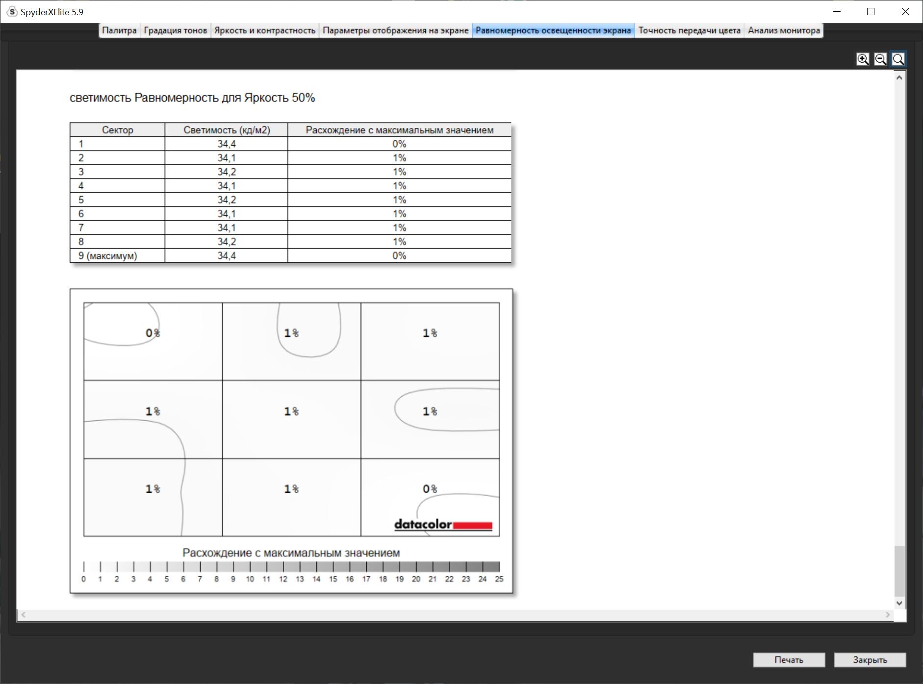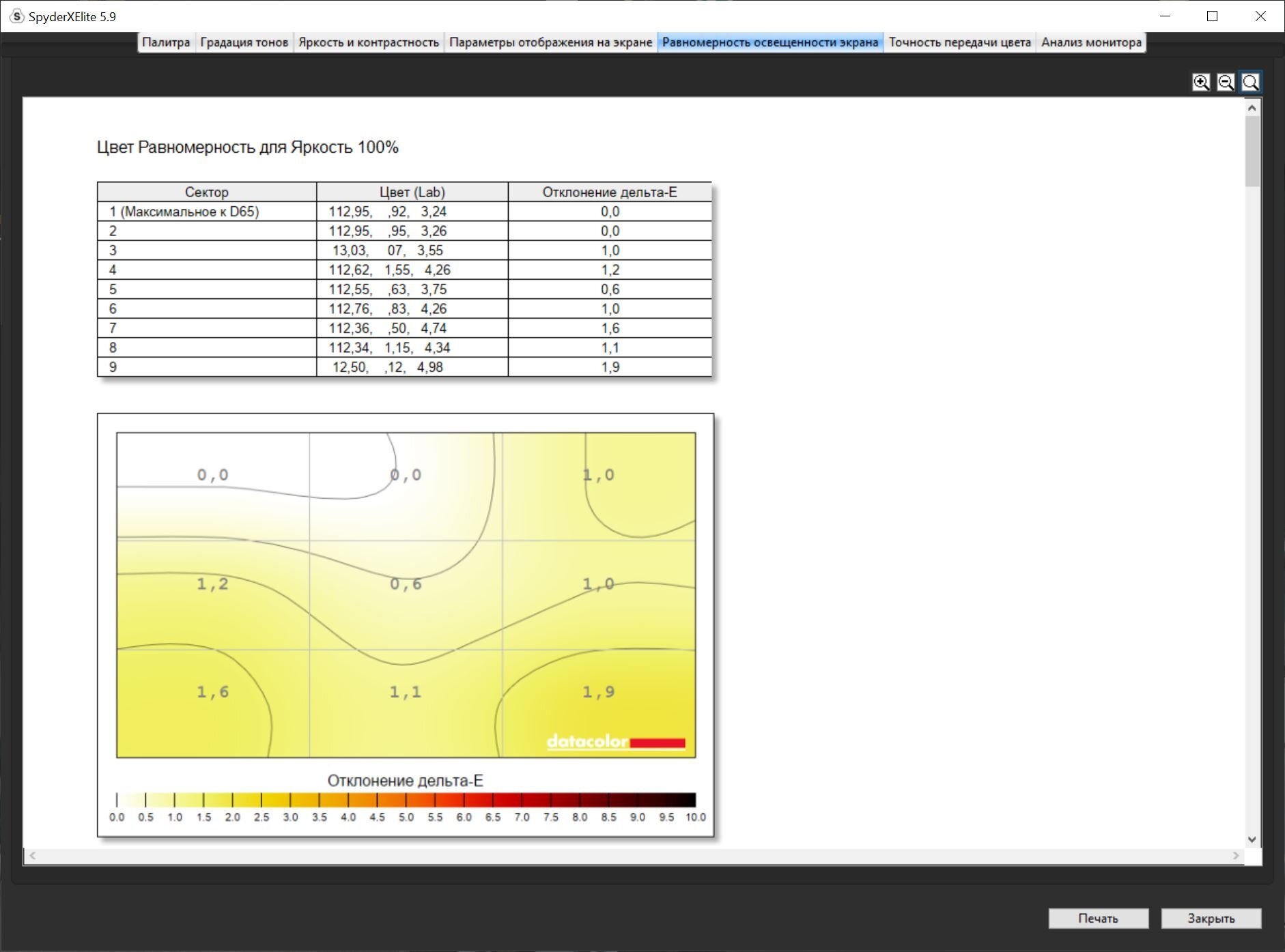 Перейдём к тестам. Замеры показывают полный или почти полный охват основных цветовых пространств, среди которых sRGB и DCI-P3. Что касается яркости, то здесь она немного выше заявленных 250 нит. При этом отклонение дельта-E наименьшее в левом верхнем углу и увеличивается в остальных углах монитора, но значения невысокие и вряд ли будут различимы.