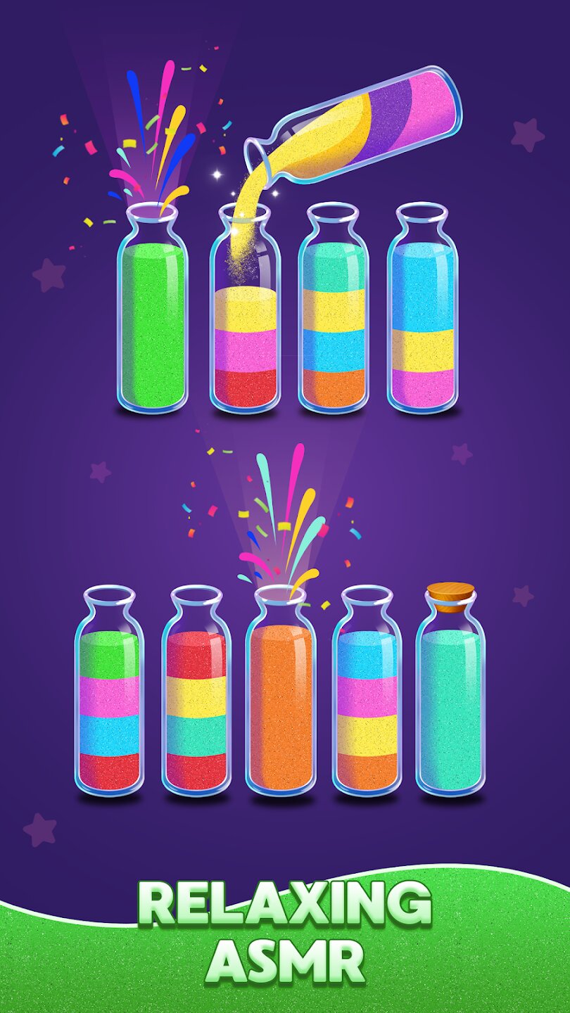 Игра предлагает глубоко успокаивающий опыт благодаря реалистичной 3D-физике песка и умиротворяющим окружающим звукам. По мере прохождения игры вы будете открывать потрясающую коллекцию бутылок уникальной формы и художественного дизайна, что добавит элемент коллекционирования. С сотнями уровней, сложность которых постепенно увеличивается, игра предлагает длительное и увлекательное путешествие, которое одновременно является медитативным и стимулирует ум.