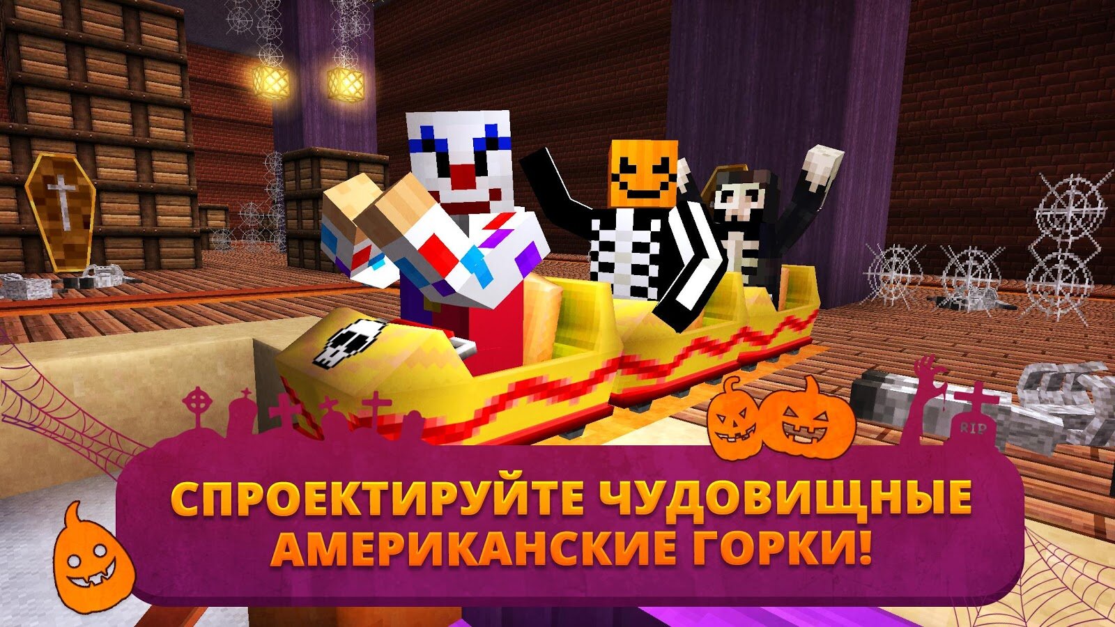 Scary Theme Park Craft — окунитесь в мир ужасов и чудовищ, где вам нужно выжить. Все окружение будто сейчас Хэллоуин, только все чудовища настоящие. Но также, в этом мире огромное количество аттракционов, которые вам предстоит посетить. Вы сможете побывать как на американских горках, так и в доме с приведениями. Вы увидите и сможете опробовать на себе настоящие и самые разнообразные аттракционы. Также, вы сможете поиграть в огромное количество мини-игр.