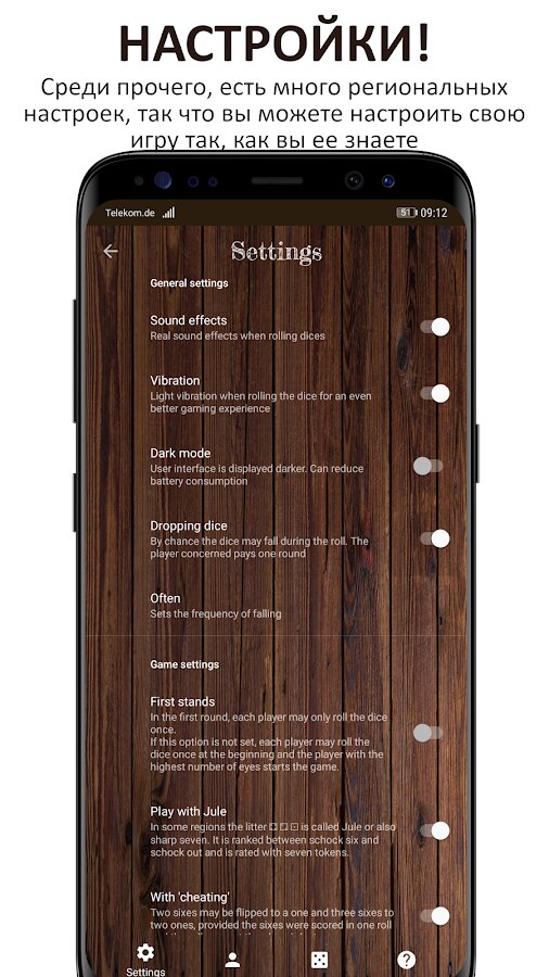 - ЛУЧШИЙ ИГРОВОЙ ОПЫТ! В настройках можно активировать мягкую вибрацию и реальные звуковые эффекты при бросании кубиков.