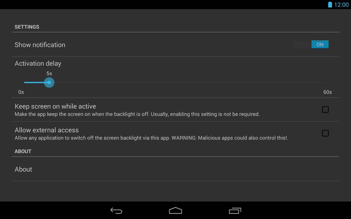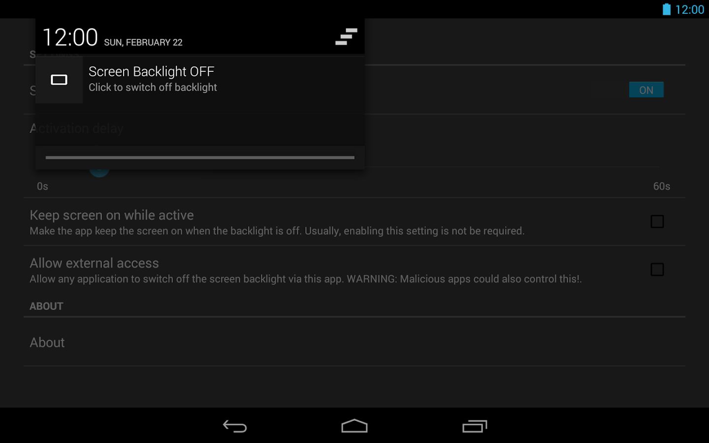 Приложение под названием Screen Backlight OFF предназначено для одной простой функции — выключение подсветки дисплея, игнорируя механизм блокировки экрана в операционной системе Android. Если говорить проще, то: выключив подсветку экрана приложение Screen Backlight OFF, вы на самом деле не заблокируете свой аппарат, таким образом различные приложения для воспроизведения видео или другие программы, которые перестают работать при блокировке экрана, продолжат выполнять свои функции.Таким образом, Screen Backlight OFF — это очевидный маст-хэв для тех, кто помногу смотрит видео на своем планшете или смартфоне, но хотел бы экономить батарею в роликах, где визуальная часть совершенно не важна.