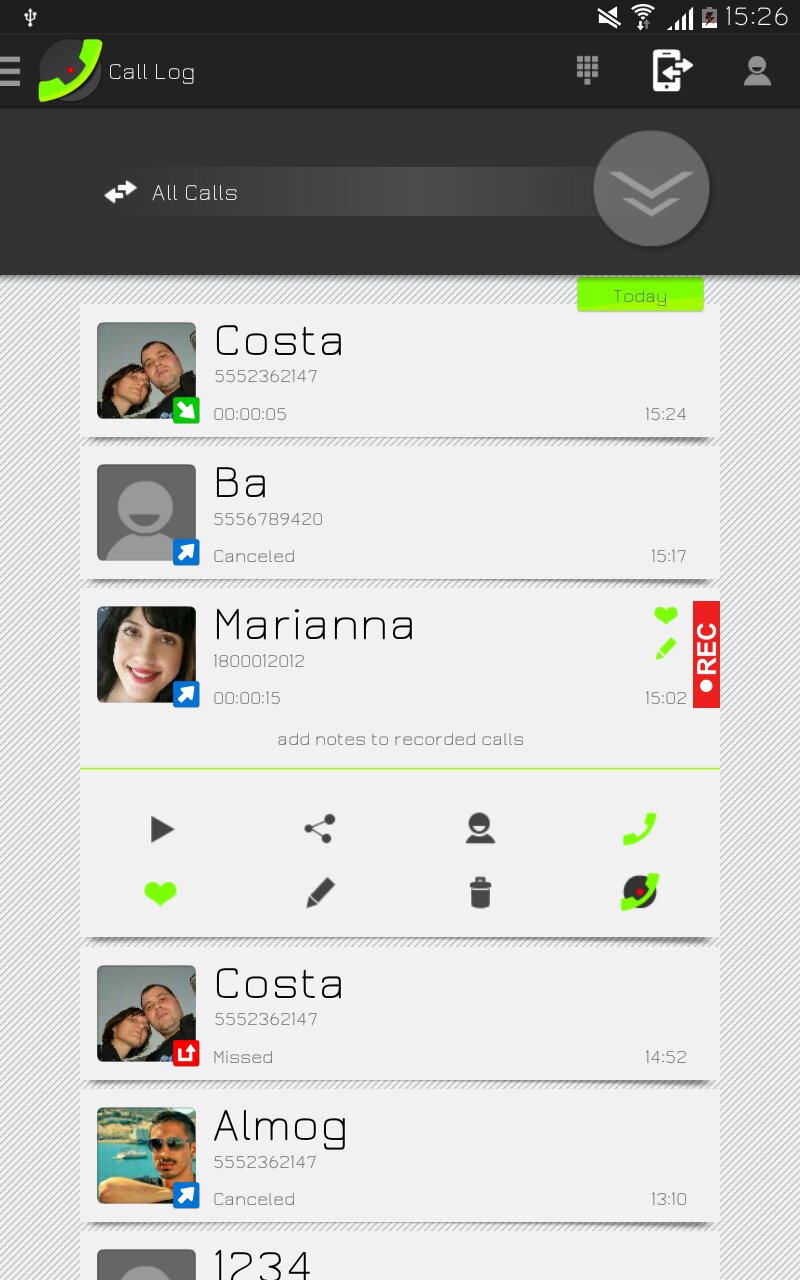 Каждый экран имеет опции сделать звонок выбирая записывать его или нет.