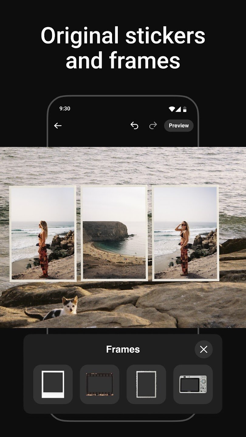- Обширная библиотека стикеров, наложений и элементов дизайна.