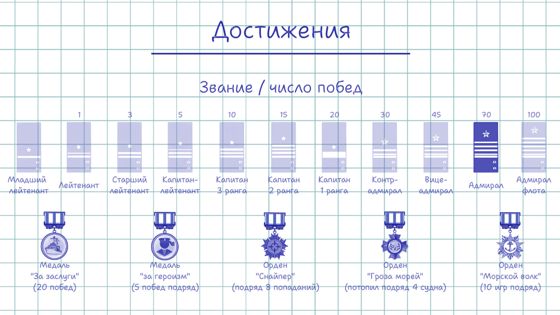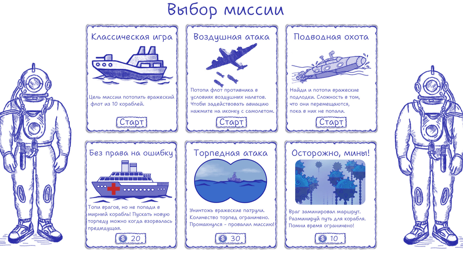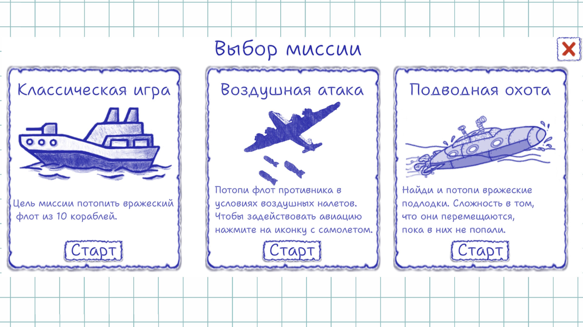 Мы постарались оживить эту увлекательную ретро игру, добавив в нее интересные анимации и механики. Все корабли как будто нарисованы на тетрадном листочке в клетку настоящей шариковой ручкой. Доступные суда разного размера, все в соответствии с классической игрой «Морской бой». Вам доступны различные боевые судна: авианосец, эсминец, ракетный крейсер, линкор, миноносец, фрегат и тральщик. Промахи обозначены кругами, а попадание крестиком.