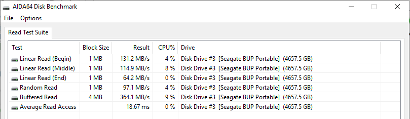 Утилита AIDA64 показывает что скорость линейного чтения в пределах 100 Мбайт/с, а скорость случайного чтения чуть ниже — около 90 Мбайт/с. В целом скоростные показатели накопителя ничем не уступают аналогичным решениям других производителей, может быть даже где-то больше. Но в этой модели скорость не так важна — в нем главное объем. А он с лихвой покрывает нужды пользователей ноутбуков, так как редко встретишь модели с накопителями объемом свыше 3 Тбайт.