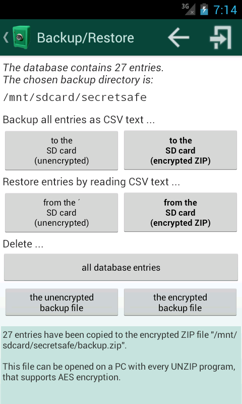 - функция резервирования всех данных основана на ZIP-AES-256 шифровании (резервная копия может быть прочитана на вашем ПК любым нормальным архиватором)
