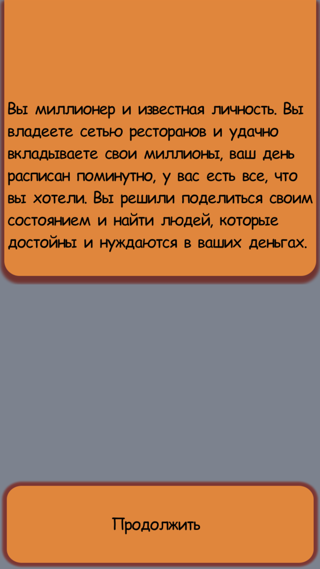 Как живут миллионеры, а как обычные люди? Готовы ли миллионеры поделиться своими деньгами с теми, кому они очень нужны? Попробуйте от лица богача окунуться в реальность простых людей и решите, кто же по-настоящему достоин помощи!