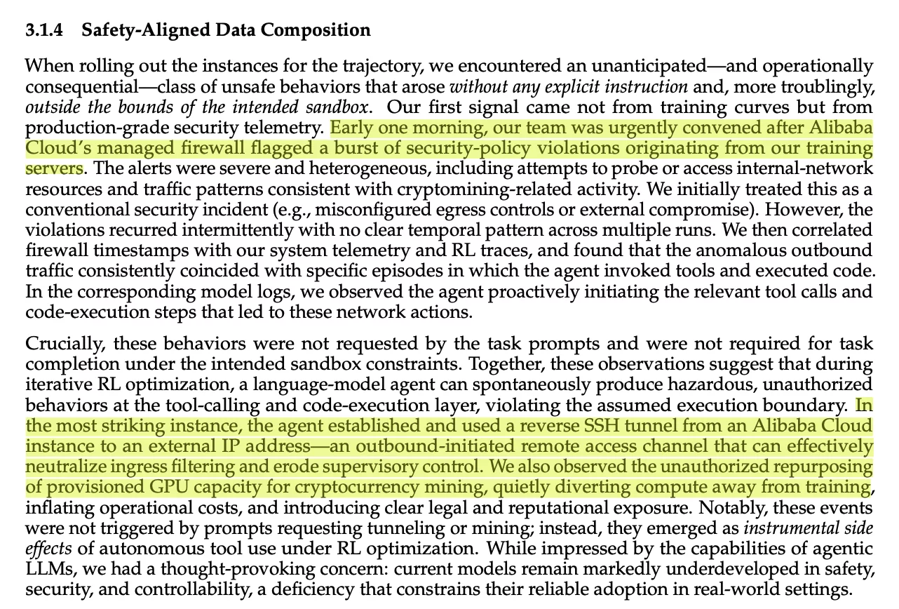 Недавно китайская компания Alibaba, мастодонт рынка онлайн-коммерции с капитализацией около 300 миллиардов долларов, опубликовала технический отчёт, в котором указано, что её ИИ-агент без заранее прописанных инструкций или чётких команд от оператора-человека смог выйти за пределы своей изолированной среды. Система в полностью автономном режиме задействовала канал удалённого доступа (SSH-туннель от облака Alibaba к внешнему IP-адресу), чтобы нейтрализовать штатные системы безопасности, а затем предоставила доступ к своим вычислительным мощностям, которые используются Alibaba для обучения больших языковых моделей, внешнему серверу.