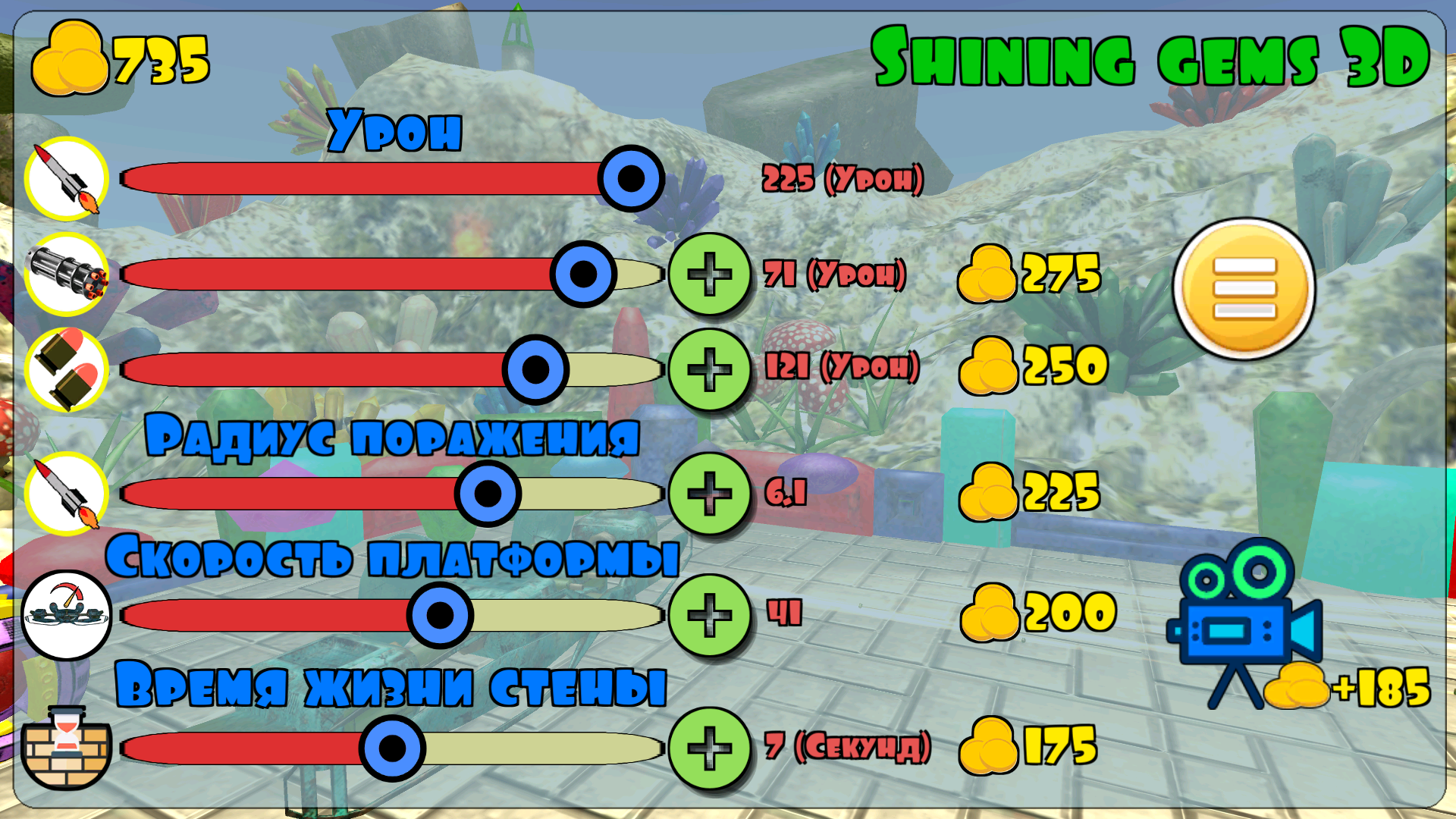 - Прокачка способностей: урон вооружения, скорости движения платформы, радиус поражения ракеты, время жизни защитной стены.