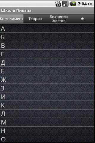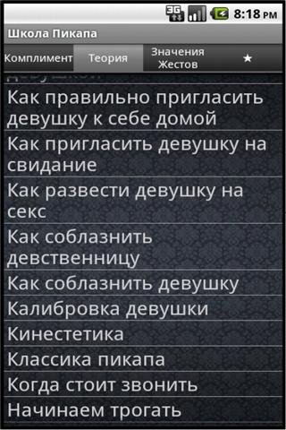 Пикап и все что с этим связано. Парни! Бывали ли у вас трудности при общении с девушкой? Бывало ли такое, что вы не знаете как обратить на себя внимание девушки, которая вам нравится? С этим приложением ваши проблемы решены! Это приложение поможет вам -Легко познакомиться с девушкой; -Понять психологию девушек; -Научиться выходить максимально «выгодно» из любой ситуации; -и многое-многое другое… Это приложение является абсолютно бесплатным, простым в обращении и одновременно информационно насыщенным. Оно не содержит рекламы. Приятного пользования и удачи вам! Описание скатано с маркета, не обессудьте :)
