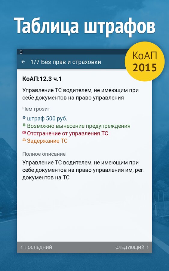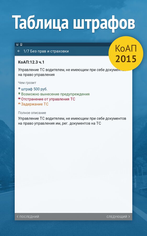 Штрафы ПДД Россия — теперь вся информация о штрафах за нарушение ПДД у вас под рукой. В данной программе можно найти не только полный справочник по штрафам, но и удобный поиск по тематике («Алкогольное опьянение», «Выезд на встречную полосу»,«Использование телефона за рулем», «Непристегный ремень безопасности»).