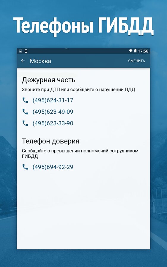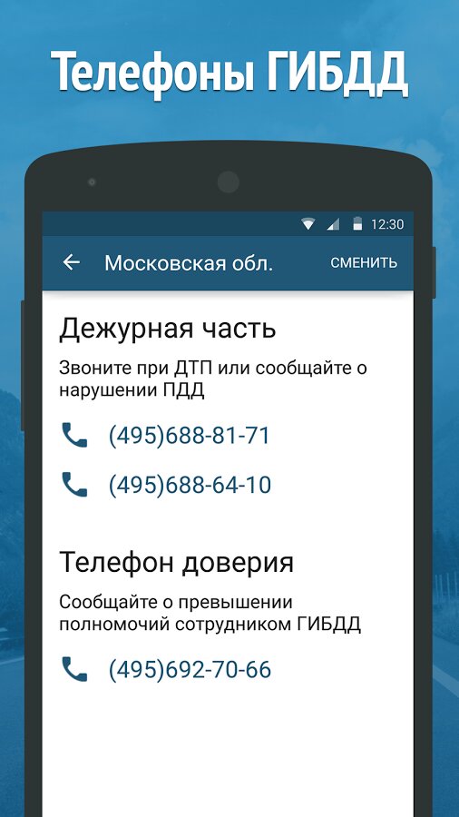 - Телефоны дежурной части и телефоны доверия для всех регионов РФ. Пригодится для вызова на место ДТП и сообщении о превышении полномочий.