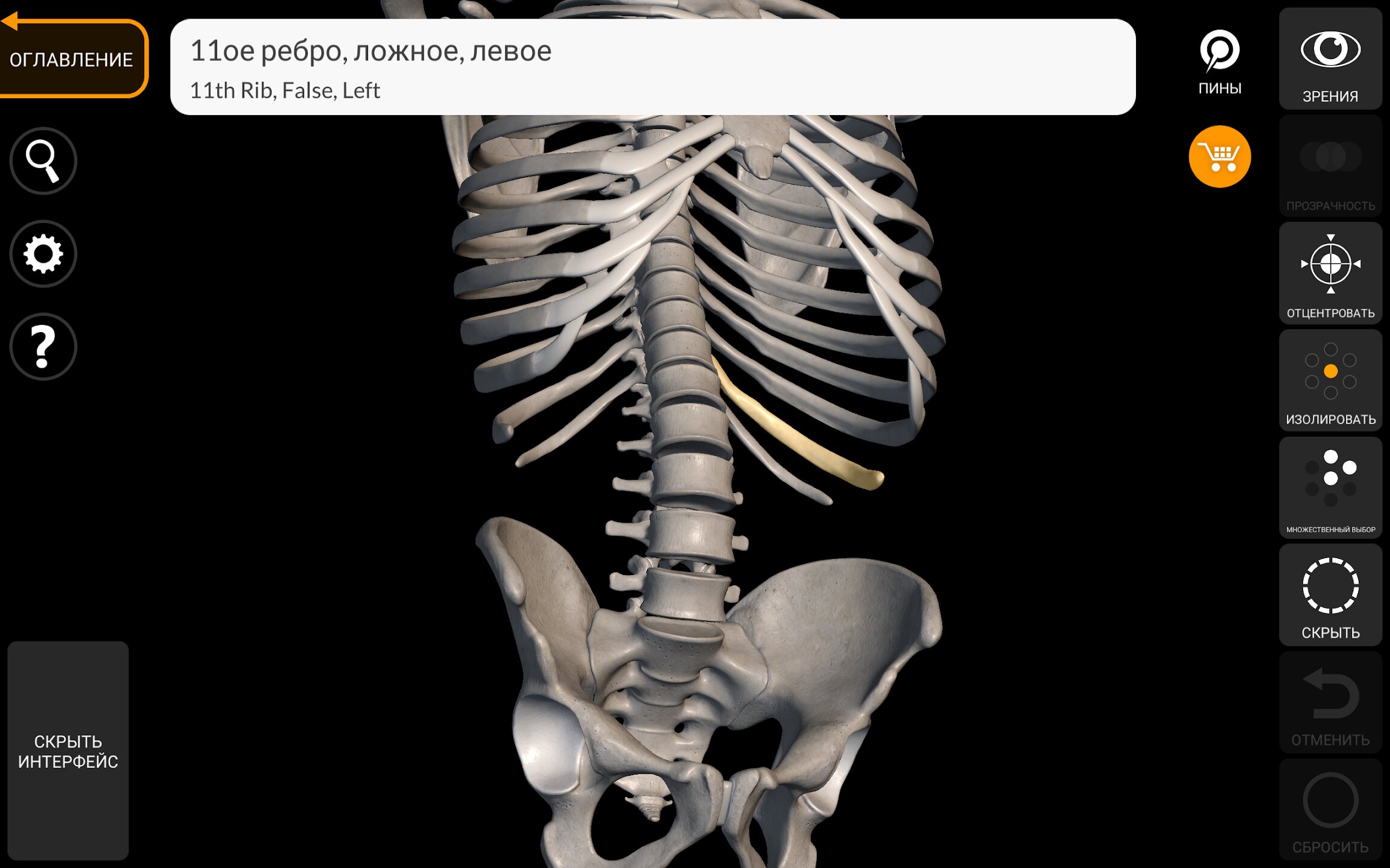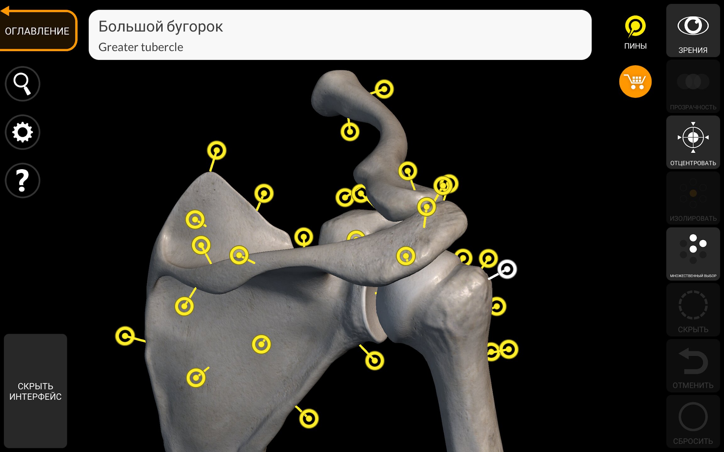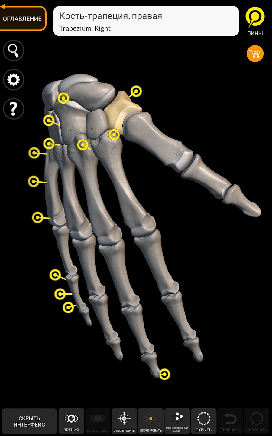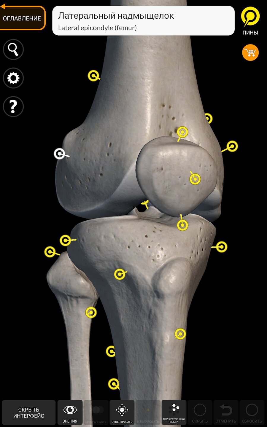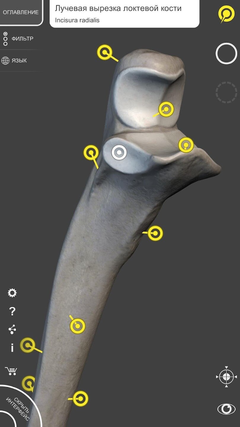 При выборе моделей или значков вам будут показаны термины, относящиеся к любой специфической анатомической части, вы можете выбрать из 12 языков и показ терминов на двух языках одновременно.