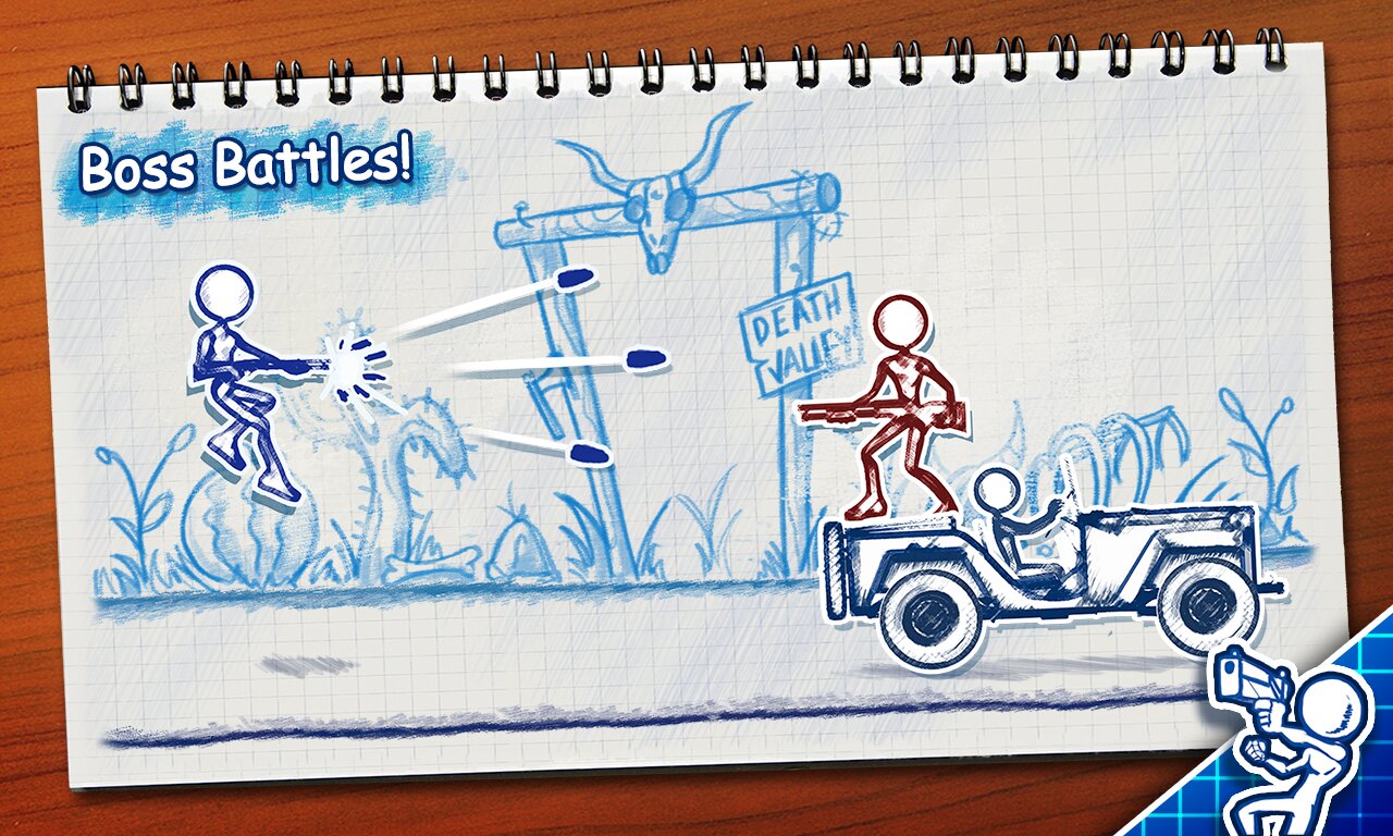 Игра с прикольной нарисованный графикой в стиле «тетрадных листков». Вы играете в роли нарисованного человечка и ваша задача перепрыгивать через препятствия и стрелять в противников. Так же, по мере вашего забега, не забывайте собирать золотые монетки, которые вам пригодятся в игровом магазине. На собранные деньги вы сможете приобрести различные усиления, апгрейды и оружия для своего персонажа.