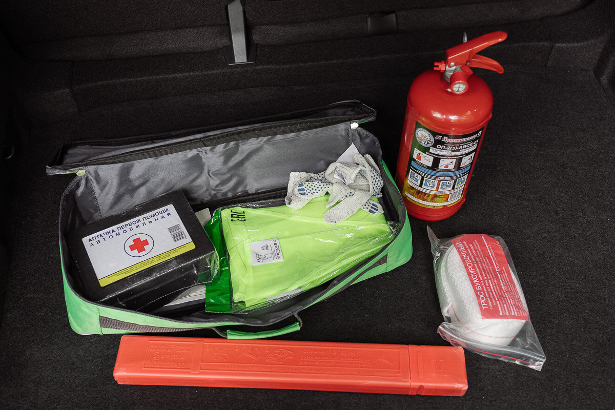 Багажник! О том, что доступ в него можно получить, просто взмахнув ногой под задним бампером уже сказал. Итак, он крупный (500 литров), в комплекте сетка для вещей, крючки, розетка на 12 вольт. Под полом докатка (не полноразмерное колесо) с набором для замены колеса в случае прокола. Также яркая зелёная сумка с набором первой необходимости (огнетушитель, аптечка, жилет, знак и трос).