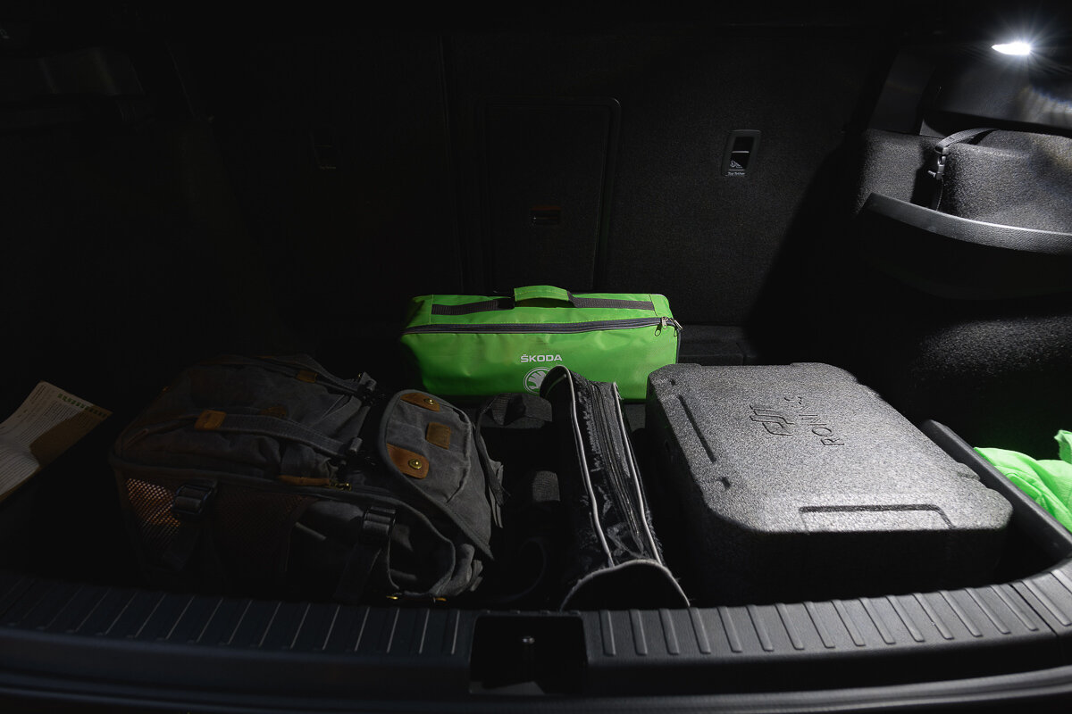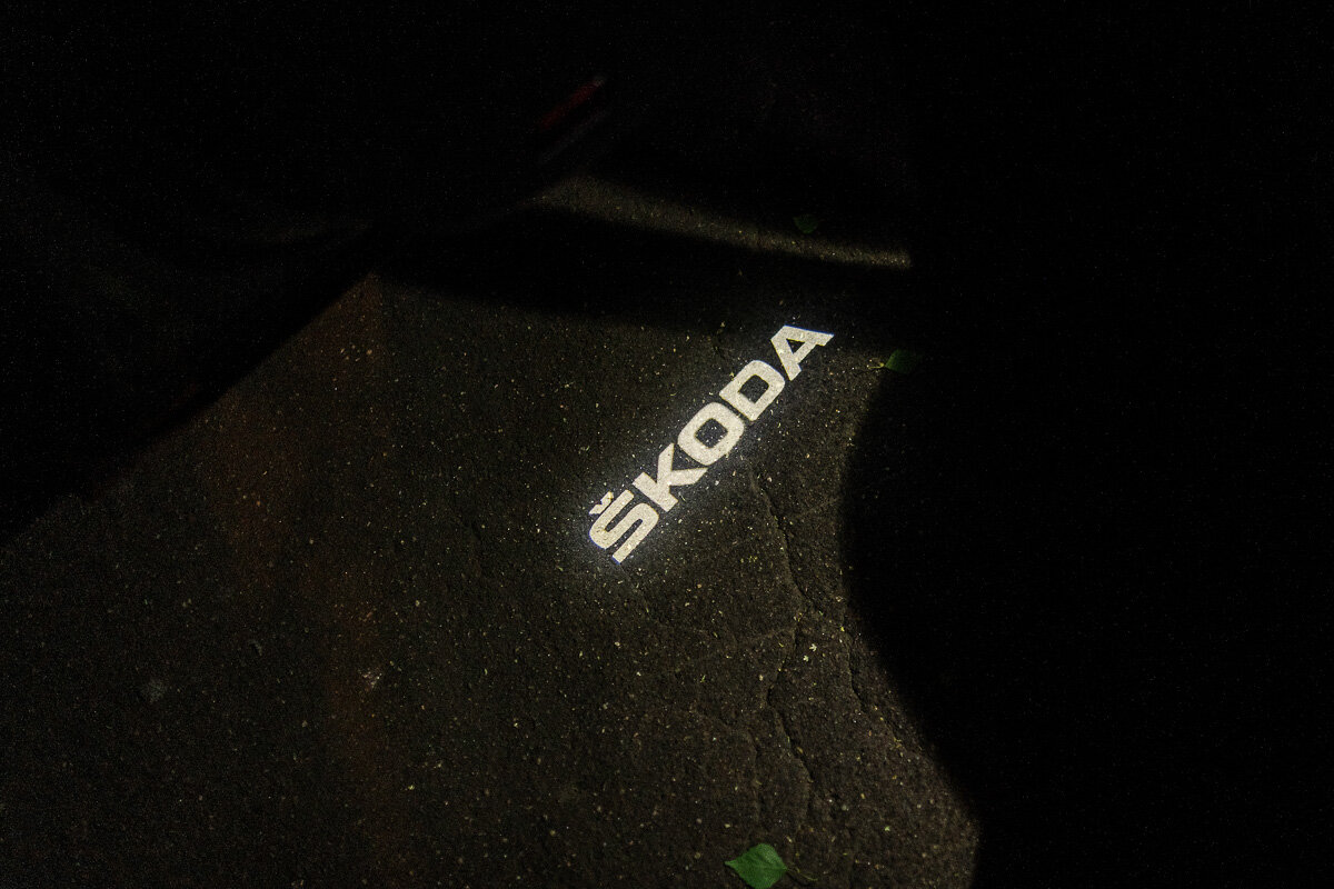 Ещё один момент, заслуживающий упоминания. В нижнем торце двери есть подсветка, но она выводит на землю слово Skoda, вместо того, чтобы просто осветить то, куда вы собираетесь ступить, покинув автомобиль. Фишка прикольная, но не более того. В целом в салоне с освещением всё в порядке. Лампочки есть даже в области ног у водителя и переднего пассажира, а вот света от одной лампочки в багажнике мне не хватало.