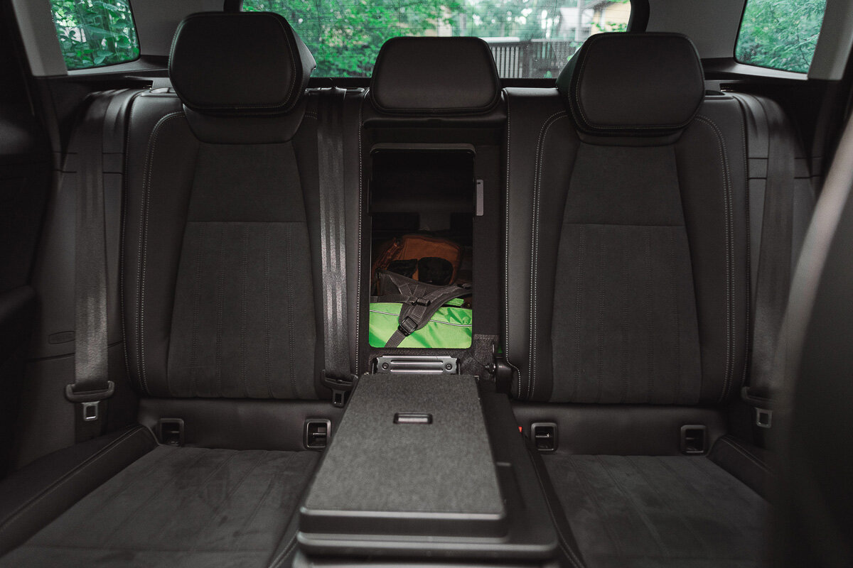 В салоне всё весьма строго, но продуманно и удобно. На заднем ряду формально три места. Но в моей конфигурации центральное место ещё и с откидным подлокотником. Также тут есть опция доступа из салона в багажник. Может пригодиться, если на улице дождь, к примеру, а надо достать небольшую сумку.