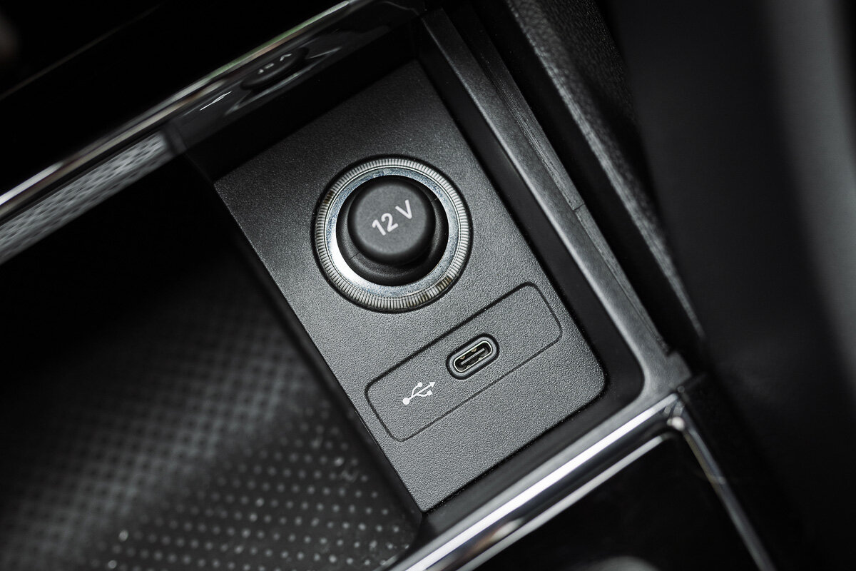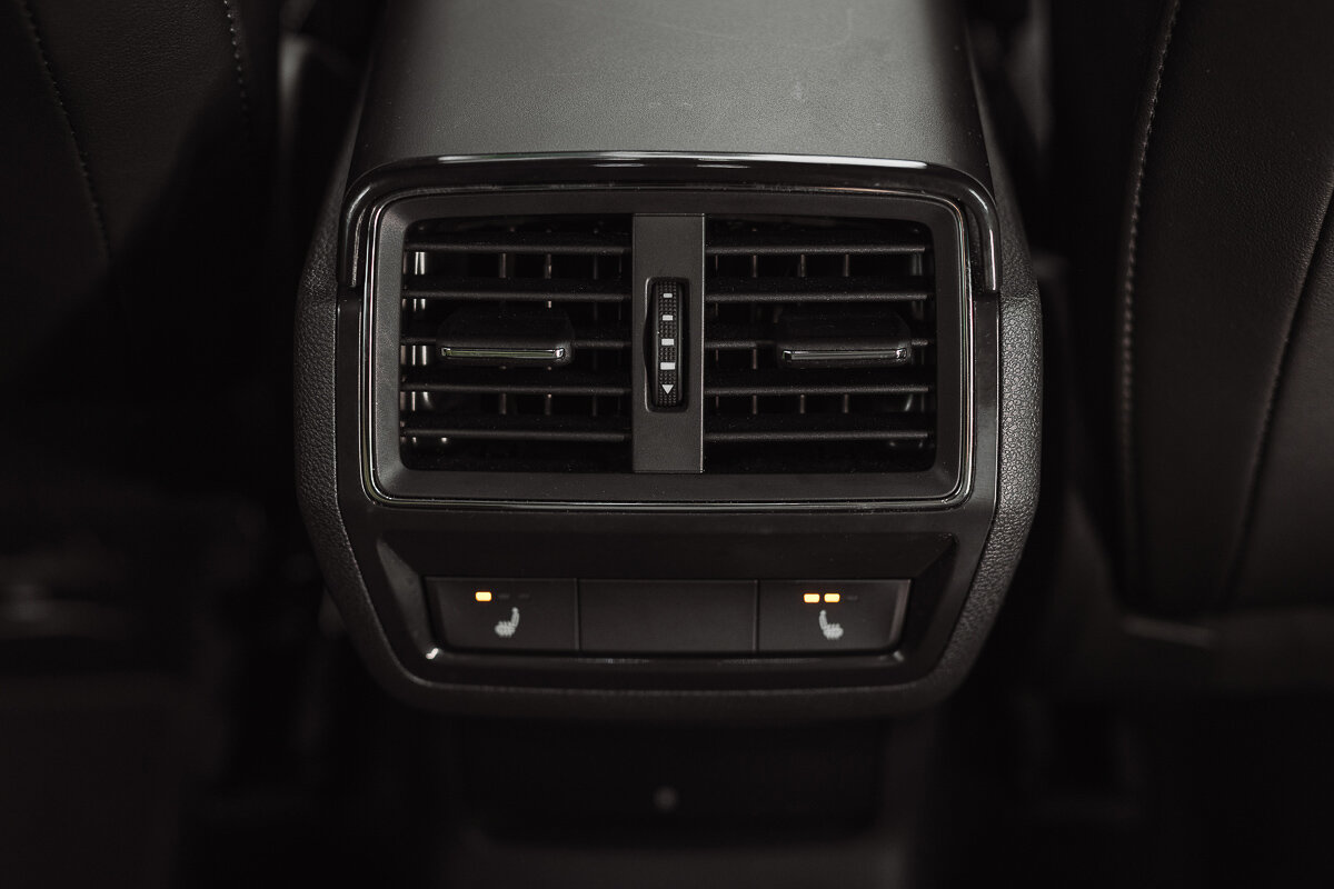 Задним пассажирам также доступна система вентиляции (в ногах и в центральной консоли). Она синхронизирована с настройками водителя. Ещё позади спрятались розетка, куда можно вставить зарядник телефона, и USB Type-C и разъём прикуривателя.