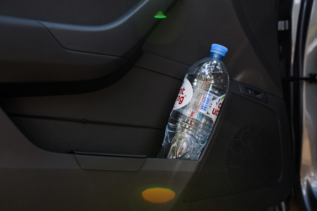 Skoda не была бы Шкодой, если не продумала множество удобных штук. Тут карманы в дверях, куда влезает полуторалитровая бутылка, резинка в остальной части кармашка, чтобы придерживать мелочёвку. Есть микромусорка (опция), хотя все, по привычке, будут пользоваться простым пакетом, но если вы любите порядок, то отличный вариант.