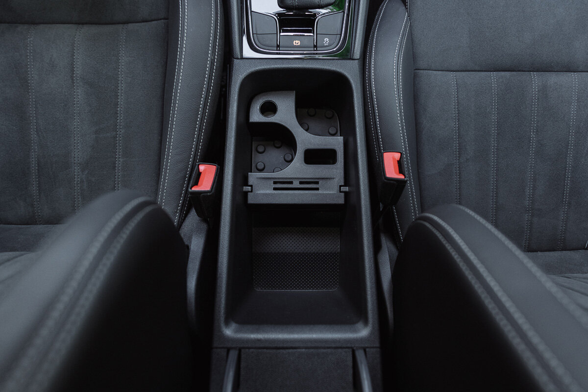 Подлокотник по центру заслуживает отдельного упоминания. Он максимально продуман. Регулируемый, откидывается, или может полностью закрывать нишу для вещей под ним. В нише свой органайзер, который можно перевернуть или извлечь вовсе. Места предостаточно. Также в центральной колонке находится ещё одна ниша, туда можно положить телефон, также там притаился ещё один разъём USB Type-C и разъём прикуривателя. Да, как вы могли уже обратить внимание, тут только Type-C. Зачем? Не очень понятно. Мне пришлось пользоваться переходником от макбука.