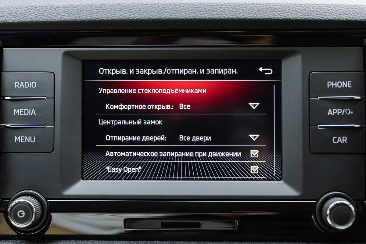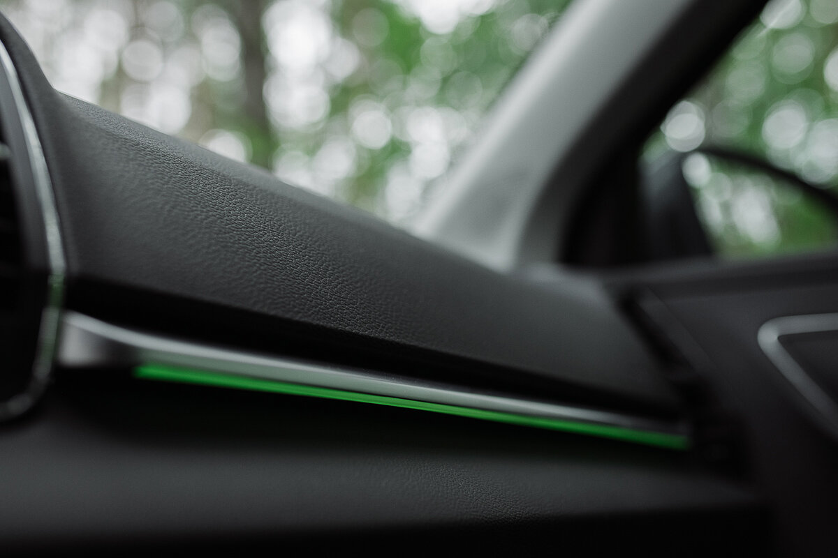Отмечу, что у меня на тесте далеко не базовая версия Style, ещё и с дополнительными опциями. Например, тут, как и в других Skoda, есть приятная подсветка в дверях. Цвет можно выбрать в настройках и от него будет зависеть и цвет этих полос, и цвет в меню бортового компьютера. Приятные мелочи.