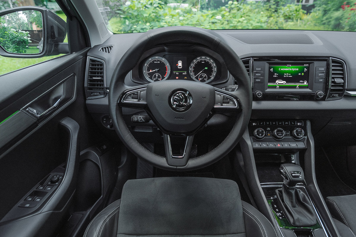 Достаточно высокая посадка, отличная обзорность и общее удобство и комфорт Karoq позволяют получать удовольствие от езды каждый день. Будь то дорога в офис в городском потоке, или же на трассе, в путешествии. А турбированный 1,4 литровый двигатель позволяет держать ритм потока, смело идти на обгон, когда необходимо. А достаточно высокий дорожный просвет позволяет смело съехать на просёлочную дорогу.
