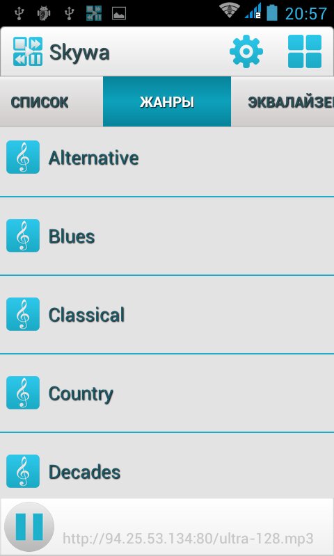 Skywa – приложение для Android, которое позволяет Вам слушать следующие форматы потоков: mp3, mp2, mp1, ogg, aac, aac+, mp4, flac, WavPack, MIDI, m3u, pls.