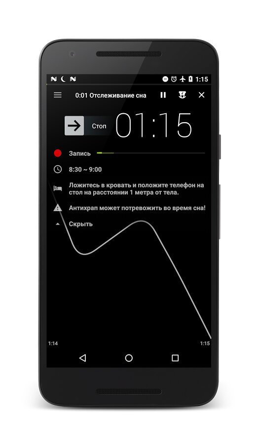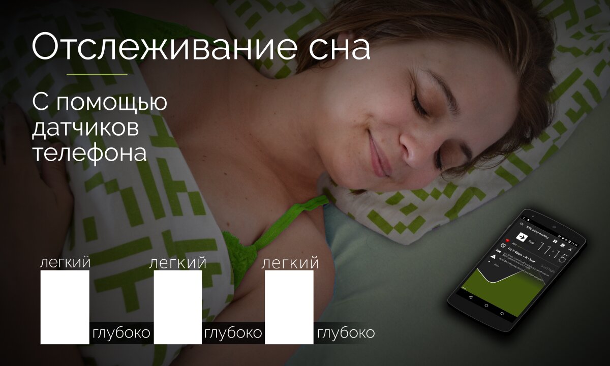 Во время ночного отдыха приложение отслеживает фазы сна. Как известно, легче просыпаться во время поверхностной фазы. Будильник сработает в нужный момент, и пробуждение будет легким. Причем приложение потребует подтвердить, что вы встали, без подтверждения будильник не отключится. Во время сна программа услышит храп и подаст сигнал, по которому над сменить позу. Этими и многими другими приятными и удобными функциями можно воспользоваться, скачав приложение на гаджет и положив на ночь смартфон рядом с собой в постель.