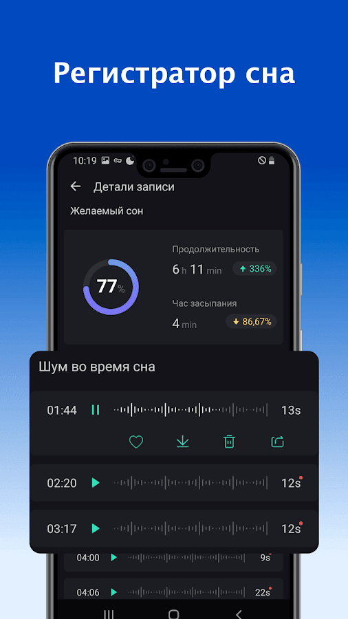 - 🎙- Записывать звуки. Sleep Monitor будет записывать храп, разговоры во сне или звуки скрежета зубами, издаваемые во время вашего сна, слушать их и узнавать больше о вашем сне на следующее утро! Ради забавы!
