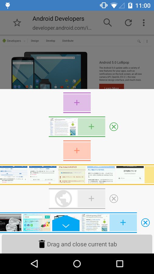 - удержание и жест вверх на вкладке для отображения группы вкладок
