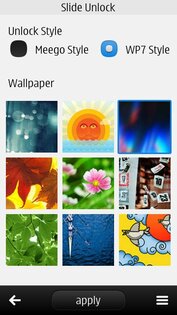 Slide Unlock — помогает выполнять разблокировку своего смартфона Symbian в стиле смартфонов Meego или WP7. Просто проведите пальцем вверх по экрану и Ваш телефон будет разблокирован! Настройки приложения позволят Вам задать стиль, который будет использован при разблокировке устройства (Meego или WP7), а также пользователь сможет выбрать обои для экрана блокировки из предустановленной коллекции изображений.