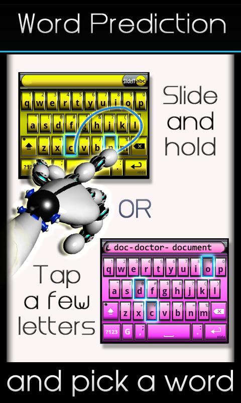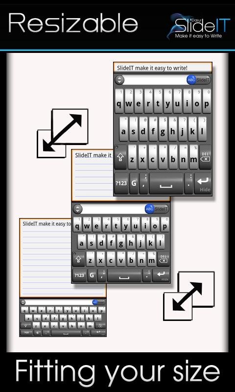 SlideIT — это революционный метод ввода текста, простой и быстрый, и намного более занимательный нежели существующие методы ввода текста. С этого момента просто проводите пальцем или стилусом по буквам клавиатуры, и они магическим образом будут образовывать слова