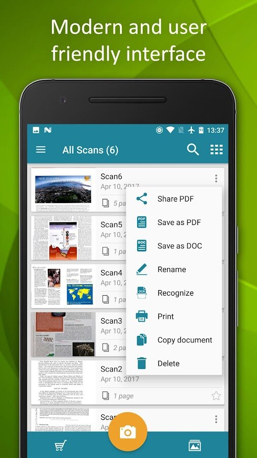 Smart Doc Scanner обладает интуитивным современным интерфейсом, возможностью быстрой обработки изображений и умным режимом контрастов для лучшего возможного сканирования.