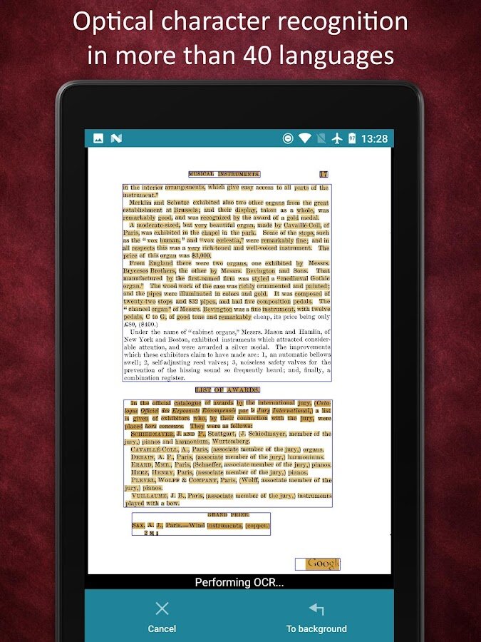 - Оптическое распознавание символов (ОРС) на более чем 40 языках для преобразования изображений в текст;