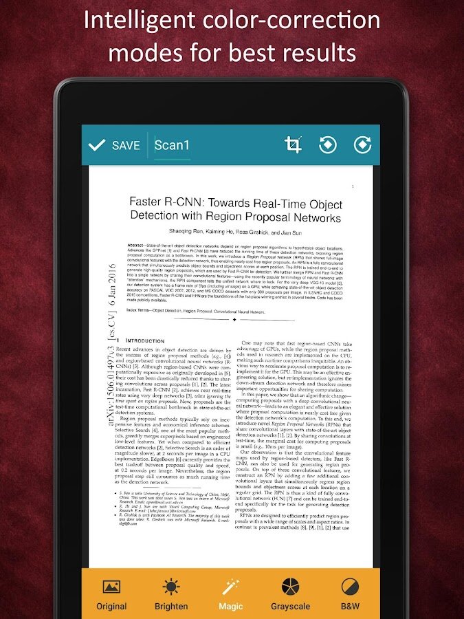 - Умное распознавание и сохранение изображений и улучшение областей с текстом с помощью современного фильтра.