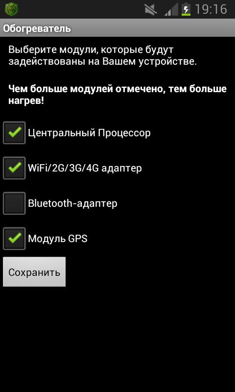 Надоели лютые холода? С нашим приложением «Обогреватель» вы сможете согреть свои руки смартфоном/планшетом на Android`е. Достаточно просто нажать «ON» и ваш телефон нагреется за 2 минуты. ВНИМАНИЕ: приложение не несет вред вашему телефону, так как нагревает его только до безопасной температуры. Также отлично подходит для разряда батареи.Приложение отлично оптимизировано для линейки Samsung Galaxy, HTC One. Наше приложение лучшее в своем классе. В приложении используется центральный процессор, WIFI/2g/3g адаптер, Bluetooth адаптер, модуль GPS.