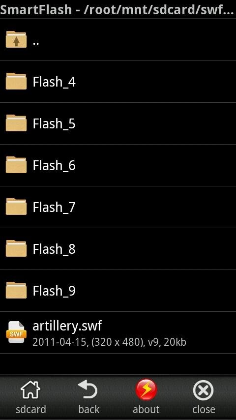 Программа Smart SWF Player предназначена для проигрывания флэш файлов в формате SWF. Воспроизведение возможно файлов, которые находятся на карте памяти или в памяти Android устройства. Просматривайте анимации, играйте в игры, запускайте приложения и т.п. Пользователям доступны элементы управление воспроизведением. Smart SWF Player поддерживает полноэкранный режим.