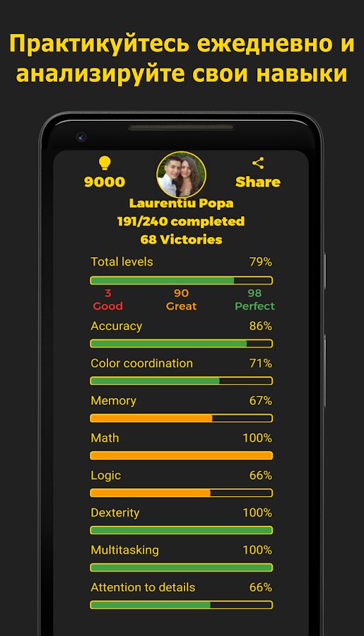 Smarter включает в себя целых 9 разнообразных категорий для прокачки мозга: улучшайте память, точность, сноровку, отточите свое внимание, логику и режим многозадачности, укрепите знания по математике и много другое. Отслеживайте свой прогресс и не бросайте начатое. Каждый пройденный уровень будет иметь свой цвет: зеленый, если вы пройдете его без ошибок, оранжевый, если вы неплохо справитесь с задачами и красный, если вы потратили слишком много времени.