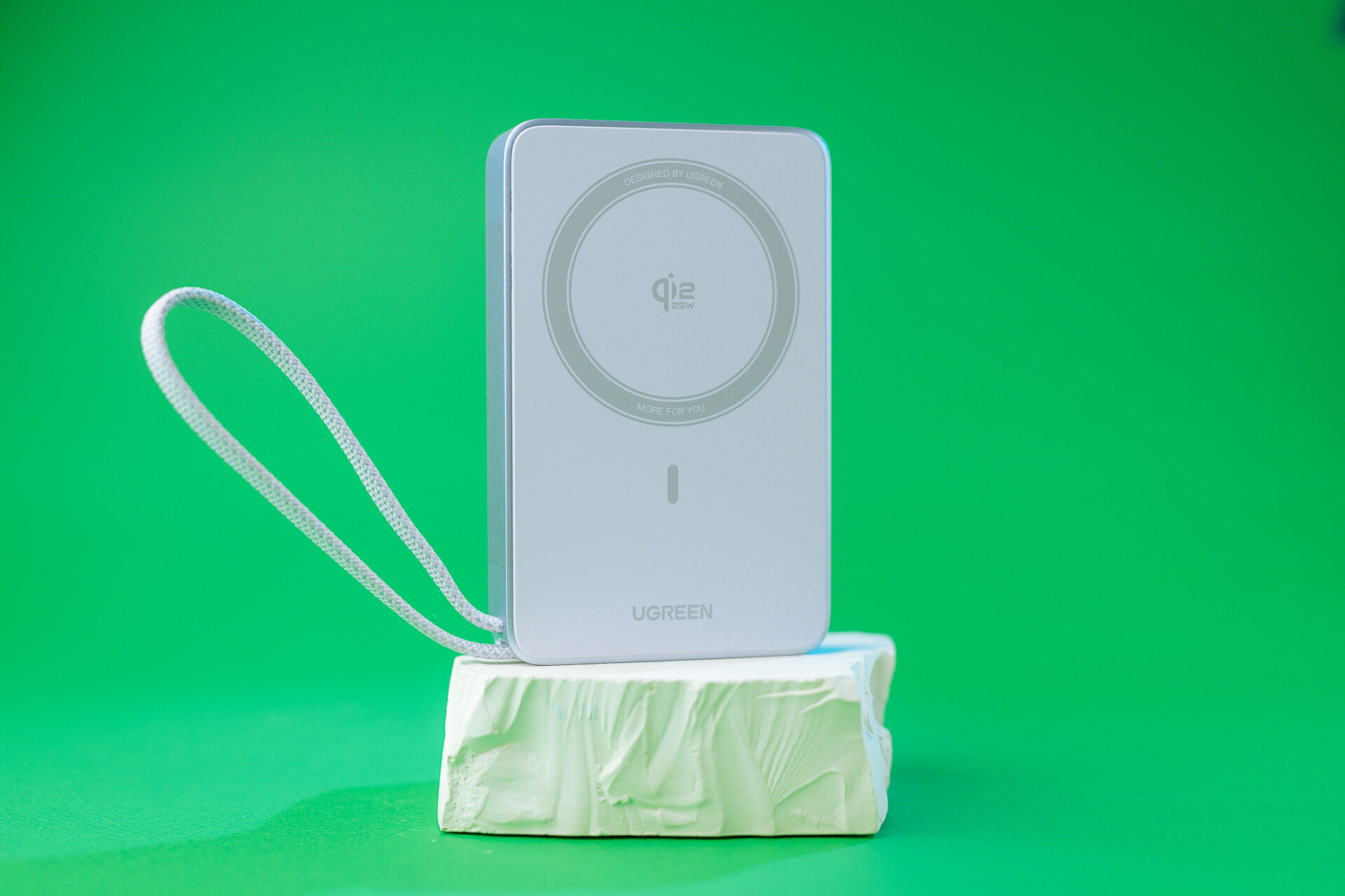 Универсальность этой модели заключается в том, что пользователь может заряжать свой смартфон как по проводу, так и без него. Дело в том, что для беспроводного восполнения энергии на корпусе повербанка UGREEN имеется магнитная площадка, поддерживающая современный протокол Qi2 25W. Она выдаёт до 25 Вт мощности и, что самое приятное, совместима с MagSafe — это значит, что если в корпусе смартфона есть соответствующий «рисунок» магнитов, он автоматически встанет ровно.