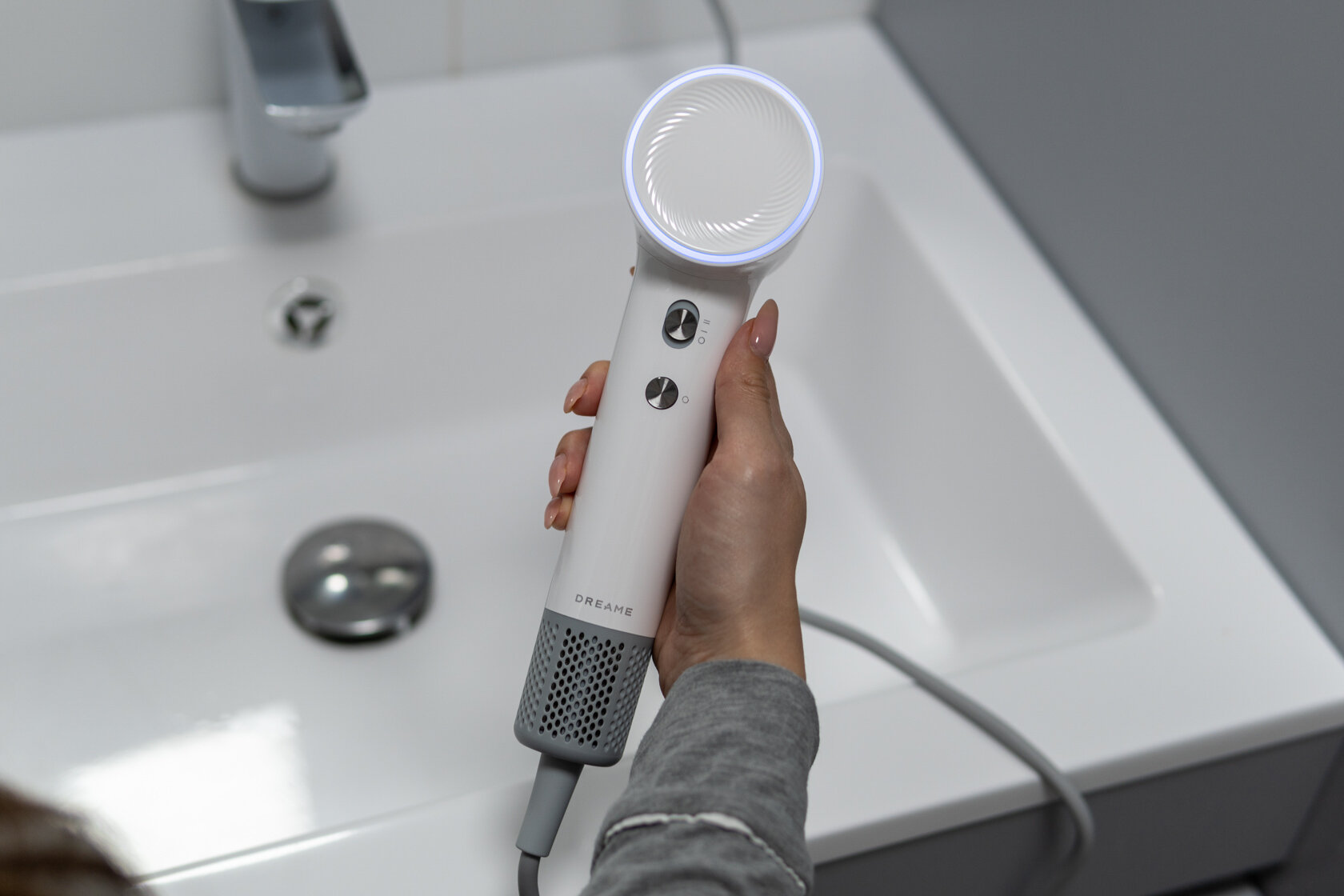 Хотя фен очень компактный и весит менее 300 грамм, мощности ему не занимать — фирменный бесщёточный двигатель разгоняется до 100 000 об/мин, формируя воздушный поток до 70 м/сек. Этого вполне достаточно, чтобы быстро высушить даже довольно длинные волосы, не говоря уже о коротких стрижках. Кроме того, модель предлагает сразу пять температурных режимов, чтобы пользователь мог подобрать оптимальное решение под конкретную ситуацию и задачу: кому-то нужен холодный воздух, а кому-то — тёплый или горячий.
