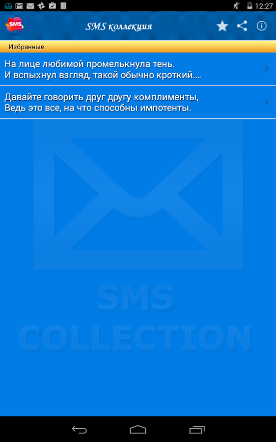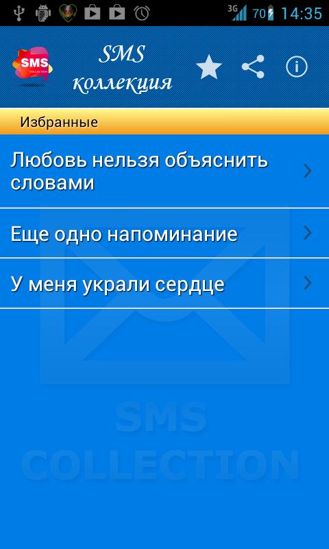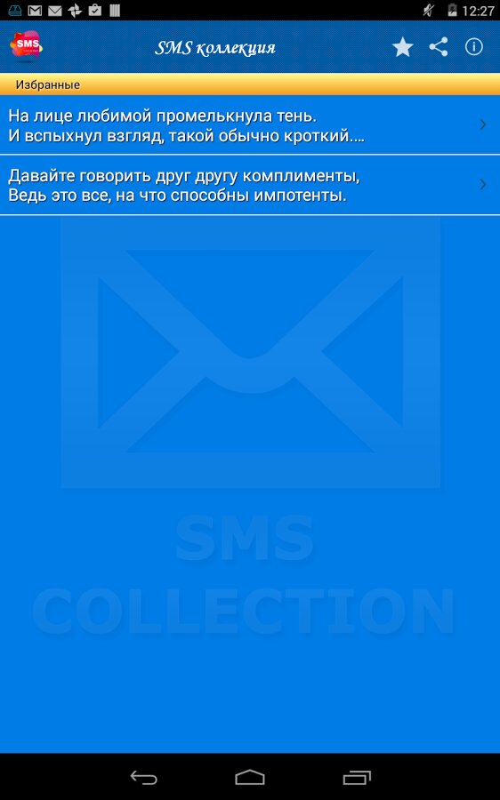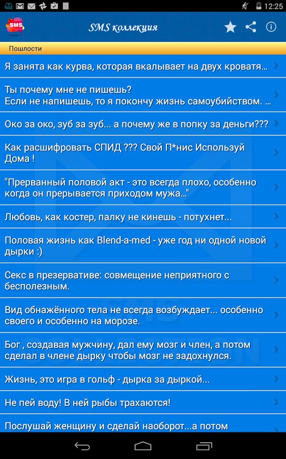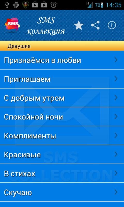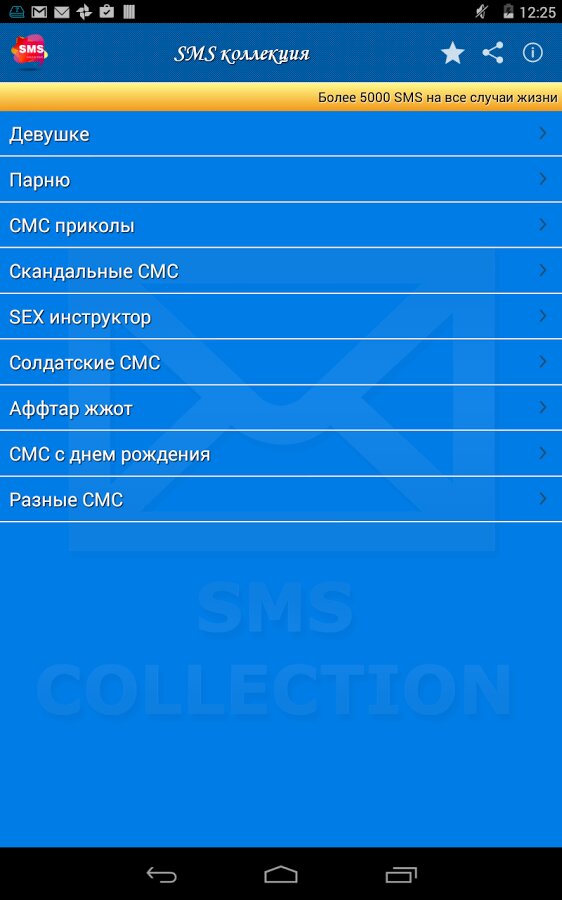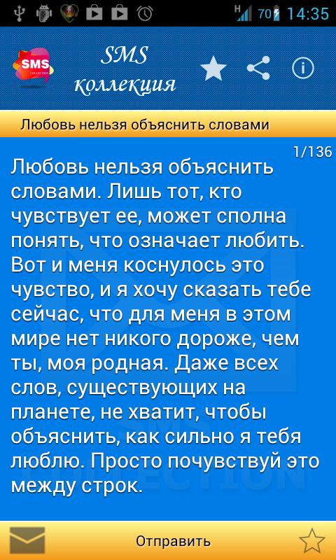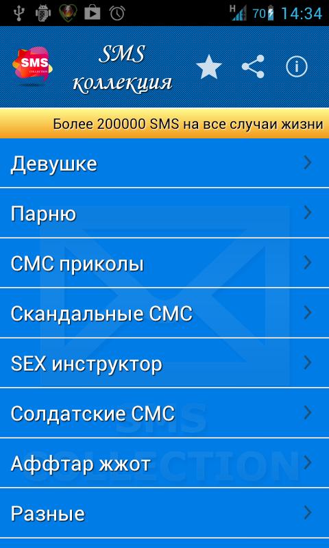 Теперь Вам не надо искать смс, копировать смс или запоминать текст смс-ки, теперь у Вас есть все эти смс в одном приложении! Приложение содержит более 100 категори и более 5000 на все случаи жизни. Делитесь друг с другом мыслями и эмоциями!