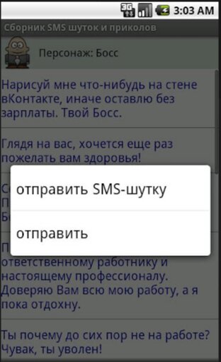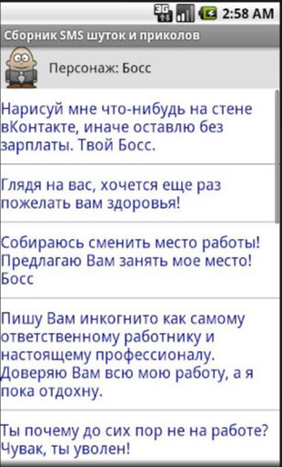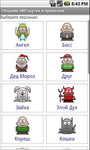 Все смски распределены по персонажам, от имени которых можно отправить любое СМС представленное в сборнике. Всего персонажей – 19.