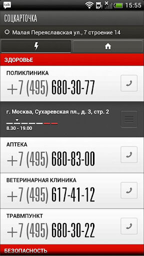 Номера экстренных служб под рукой.Соцкарточка — Находка для тех, кто только начал самостоятельную жизнь, недавно переехал в новое место или оказался в сложной ситуации и не знает, куда обратиться за помощью.Программа автоматически определяет ваше местоположение и выводит список упомянутых полезных заведений с номерами телефонов, адресами и даже часами работы. Прямо из интерфейса приложения можно совершить вызов или перейти к странице с информацией о службе и карте.Адрес можно вбить руками на случай, если вас интересует информация о другой местности. На данный момент сервис работает только в Москве и Зеленограде, но планируется добавление и других городов. В приложении собраны адреса и телефоны экстренных служб (травмпункт, ОДС, ГИБДД, штрафстоянка и др.).Для государственных учреждений (поликлиника, почта, управа района, библиотека, избирательный участок и др.) указаны адреса, телефоны и время работы.
