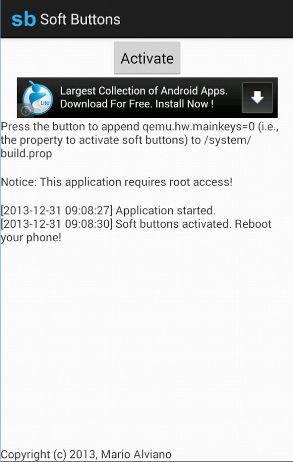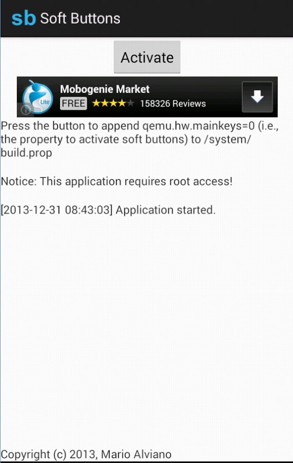 Soft Buttons — это очень простое приложение для включения софт-кнопки на взломанных телефонов. Он просто добавьте строку qemu.hw.mainkeys=0 /system/build.prop. Очевидно, вы можете редактировать этот файл по себе… цель настоящего приложения заключается только сэкономить несколько вашего времени!